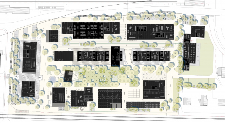 Aus dem Fundus der vorgefundenen, vielfältigen Raumstruktur und Materialisierung werden spezifische Aussenräume entwickelt und so der Bezug zur industriellen Geschichte des Ortes sichtbar gemacht.
