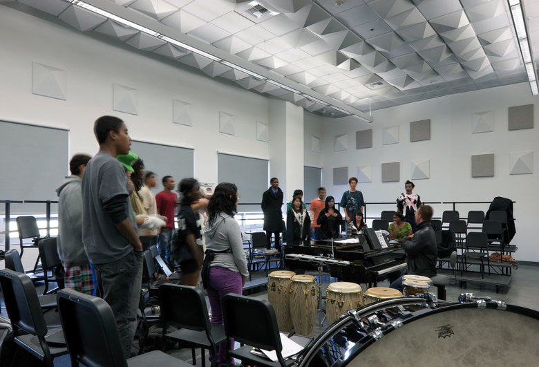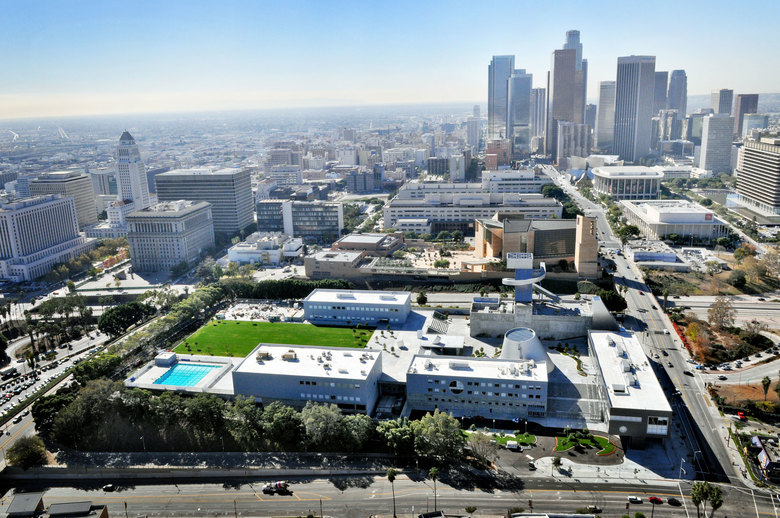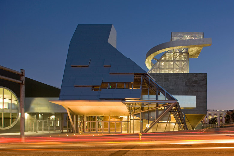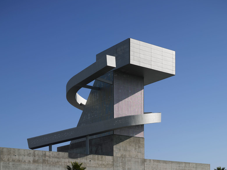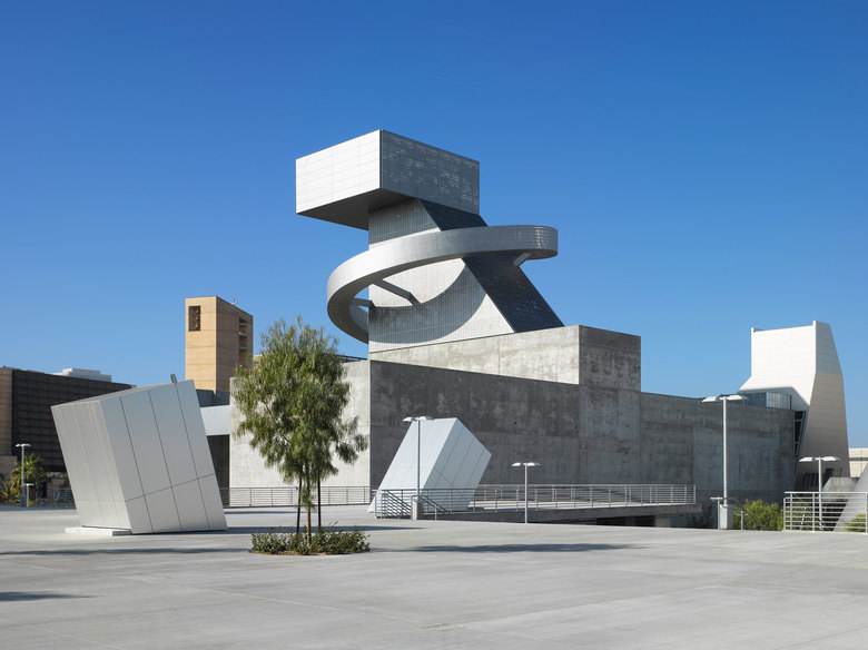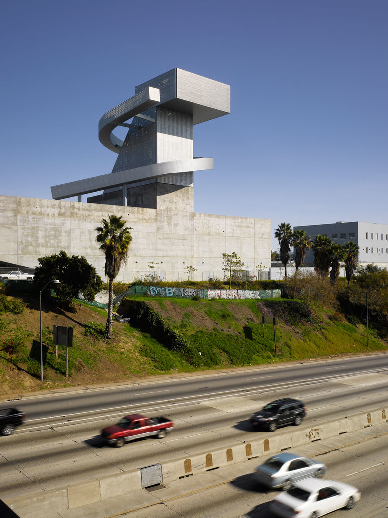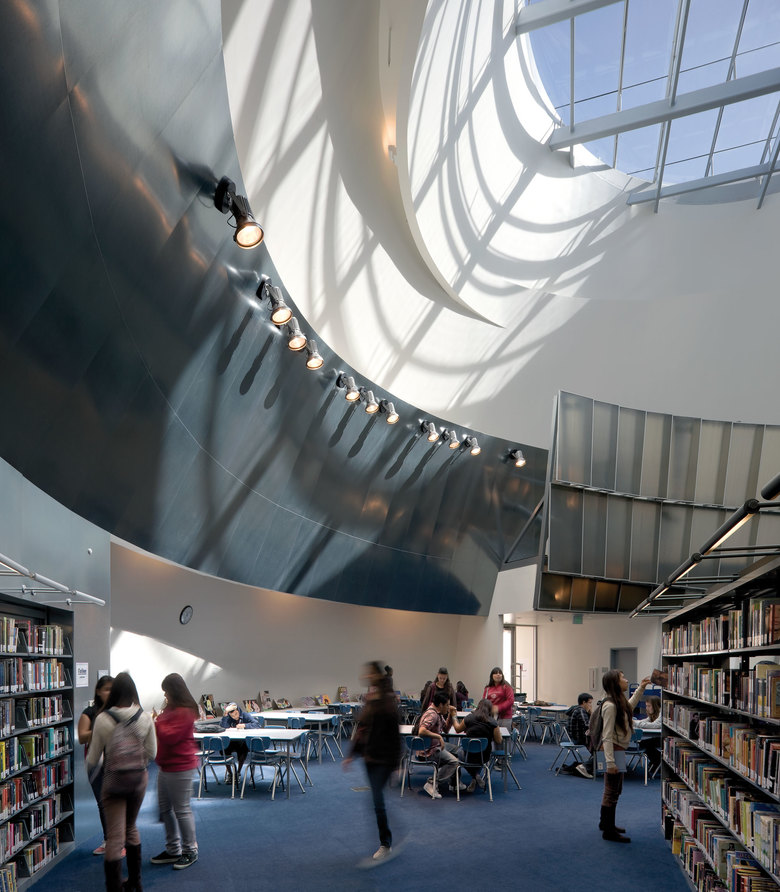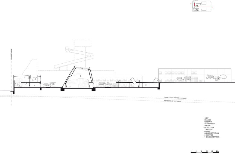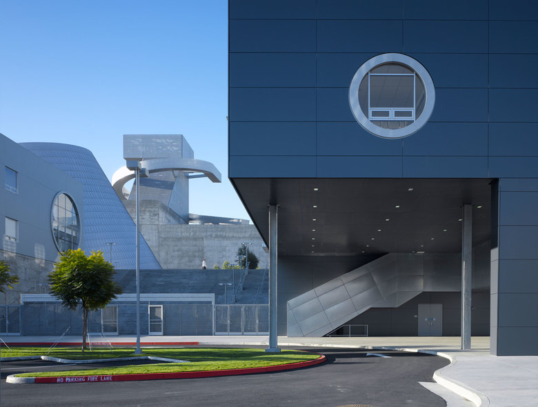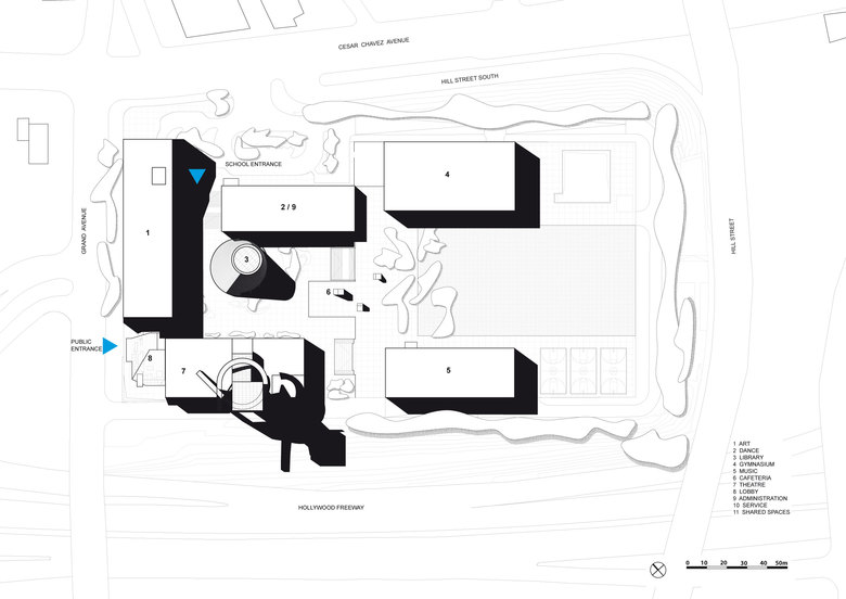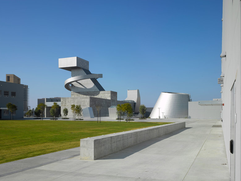 Like chess figures three sculptural buildings dominate the campus of the High School #9: a tower as sign for the arts, a public lobby, and the library in the center. All three buildings can be seen from the main school entrance via a 24 m wide grand stair. The central location of the site downtown, separated from the Grand Avenue corridor by the 101 freeway and thus visually exposed along the edge of one of the most widely used thoroughfares in downtown Los Angeles, served Coop Himmelb(l)au as the point of departure for the architectural concept for the school. To provide public spaces within a high school through the architecture and supported by the performing arts program is one of the main contributions of this project to education and the community, and unique in contemporary public school buildings in Los Angeles. The facilities for the four academies for Visual Arts, Performing Arts, Music and Dance are used by about 1,800 students and include classrooms, studios and administrative spaces. Shared spaces are grouped around the main school courtyard: the library, a public 950 seat performing arts theater, a cafeteria, administrations spaces, science rooms, and open air facilities.