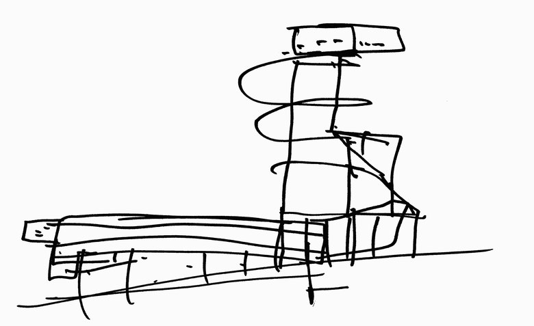 Architectural Signs - Chess Concept – The theater complex consists of the entrance lobby, main auditorium with orchestra pit, stage with fly loft, back stage, and an outdoor amphitheater with stage area. The theater with a seating capacity of 950 visitors will allow the students to learn all technical aspects of operating on a professional stage and will be open to the public for performances. A tower with spiralling ramp in the shape of the number 9 is located on top of the theater’s fly-loft serves as a widely visible sign for the arts in the city. Inside the tower, an event, conference and exhibition space with a view across the city is located. As the symbol for learning and education the library is formally expressed through a slanted, truncated cone and placed in the center of the school courtyard. Inside, the cone provides a large open space illuminated from above by a circular skylight. This offers an open, dynamic, but introverted and concentrated space for contemplation and focused learning.The four classroom buildings form the perimeter of the school’s interior courtyards. The functional boxes house one academy each as well as other shared educational and administrative spaces. Each building is organized with a central corridor which doubles as an exhibition gallery. Generous open public stairways with lookout points to the exterior and expressive entrances serve as transition spaces between the exterior and interior. Each academy building houses its general classrooms, art studios, workrooms, and satellite administration spaces. Along Grand Avenue and at strategic viewpoints around the site large round windows are placed to create a distinct and lively exterior and to allow passers by a glimpse of the activities within the school. Likewise, students inside the buildings will have visual contact with the city with constantly changing perspectives and frames. In addition to the public entrance on Grand Avenue the seven buildings frame the representational main school entrance. A 24 m wide grand open stair leads directly into the main school courtyard with the conical library in its center and theater and tower in the background. The main entrance symbolically sets the stage for the students to experience this school as a decisive stage in their life and education.