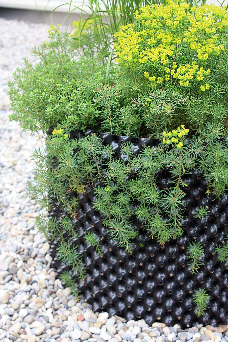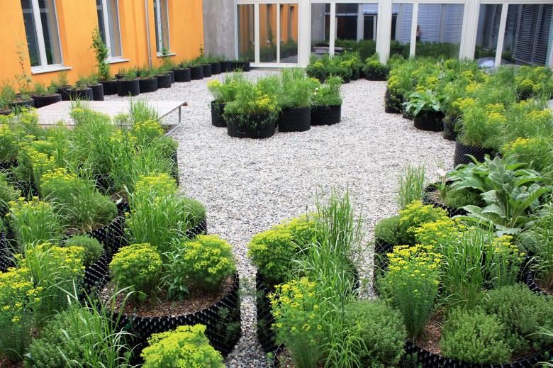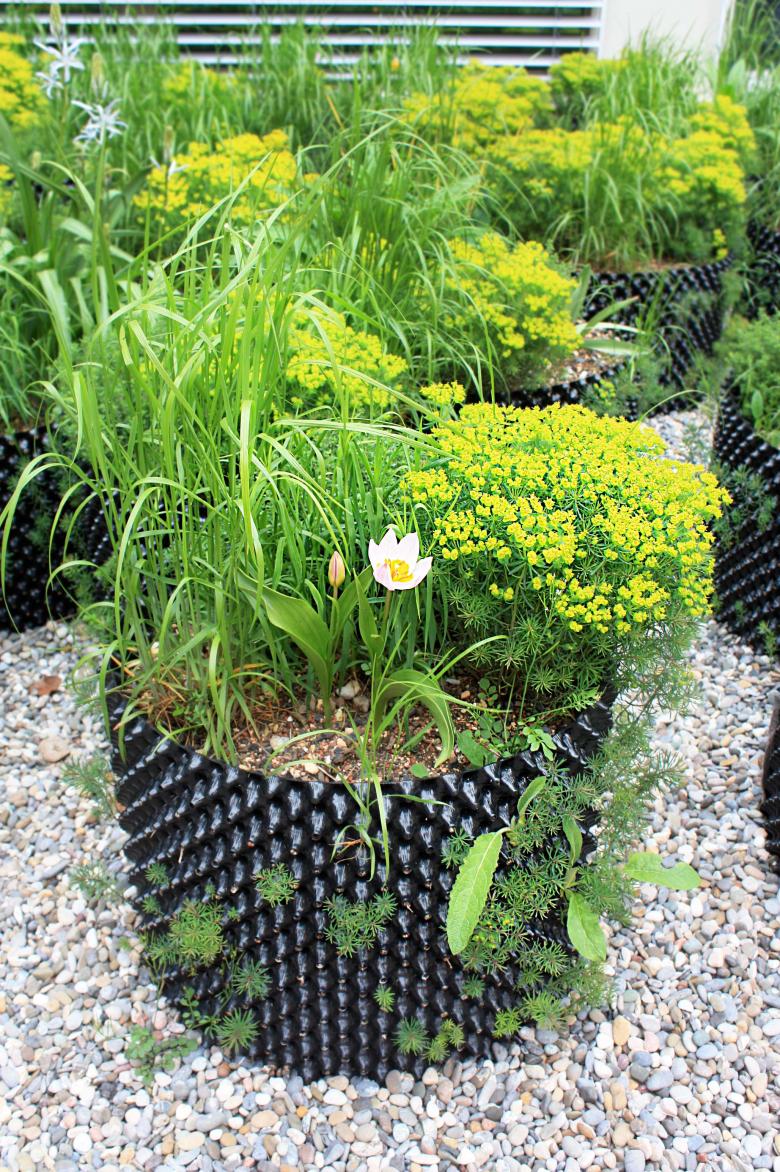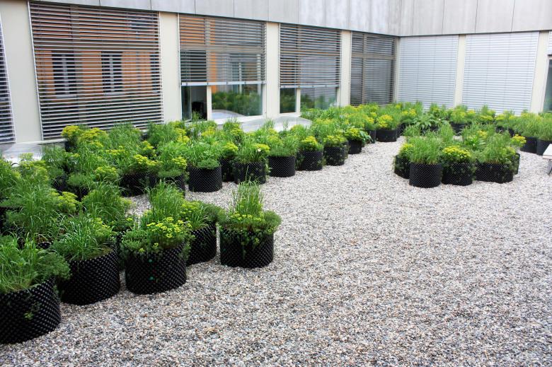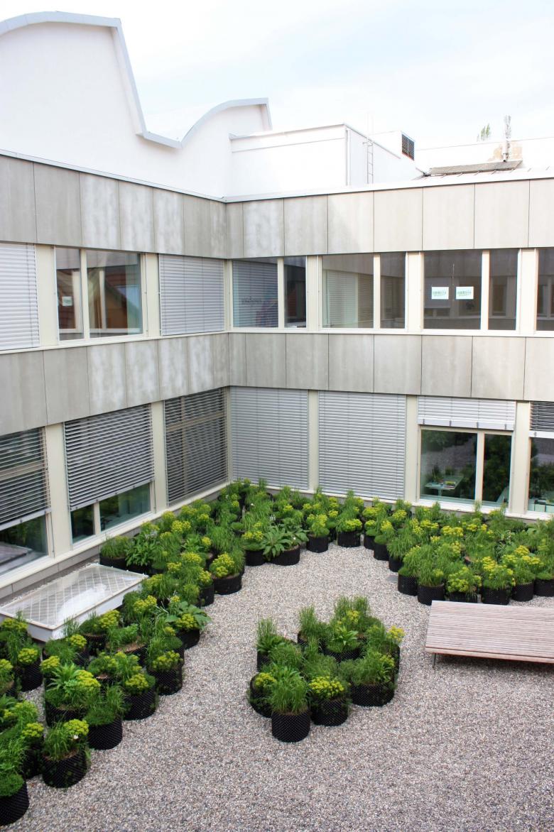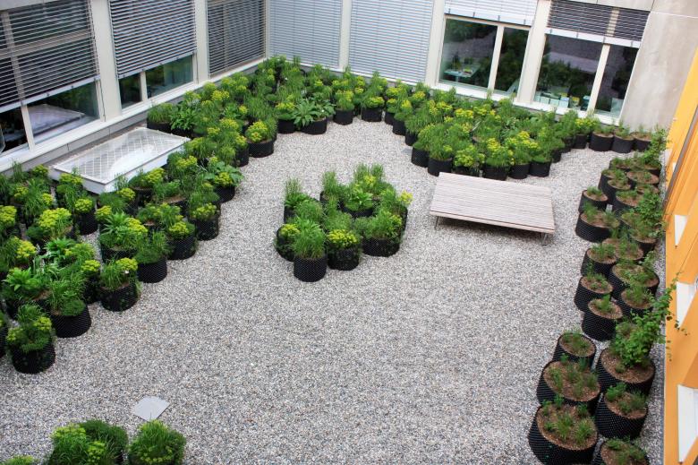 Ein vollflächiger Kiesbelag wurde als praktikable Lösung gewählt. Dieser Belag erhöht den Kontrast von Innen zu Aussen sowohl optisch als auch haptisch. Um die üppige Vegetationsschicht umsetzen zu können, wurden perforierte Folien, die in Baumschulen Einsatz finden, als Pflanzgefässe eingesetzt. Diese sind kostengünstig, bestechen durch die maximale Durchlüftung und sorgen somit für eine optimale Durchwurzelung.