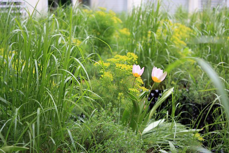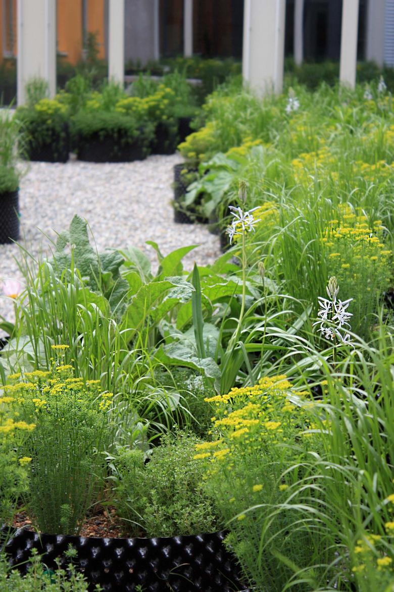 Die Pflanzung besteht hauptsächlich aus einheimischen Stauden für Trockenstandorte und punktuell eingesetzten Exoten (Steppe/Prärie), die alle ohne künstliche Bewässerung auskommen. Struktur- und Farbkontraste der Stauden und jahreszeitliche Veränderungen sorgen stets für abwechslungsreiche und spannende Stimmungen. Insbesondere die natürliche Sukzession wird durch den Kontrast der Künstlichkeit der Pflanzgefässe und den Stauden, die dieses Material für sich einnehmen und beanspruchen, sichtbar und erlebbar. Ein schlichtes, grosszügiges Holzsitzmöbel schafft Platz zum Verweilen und Beobachten.