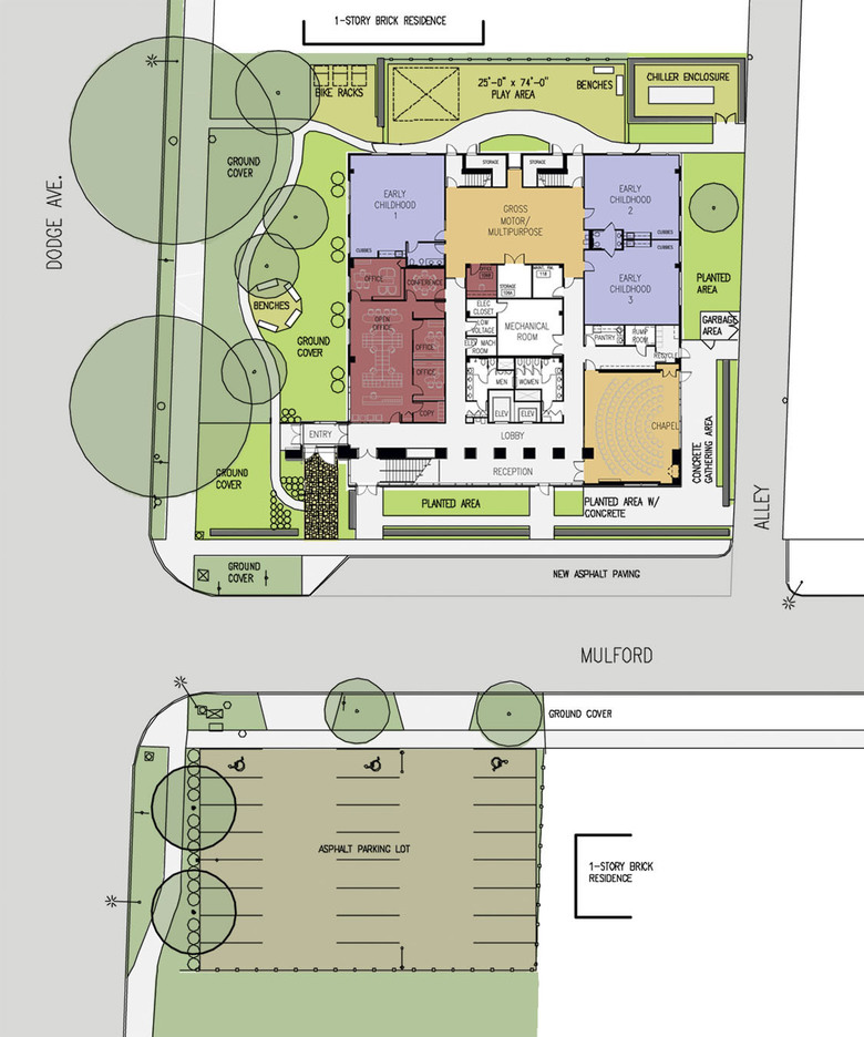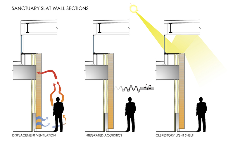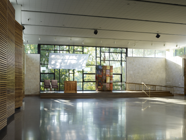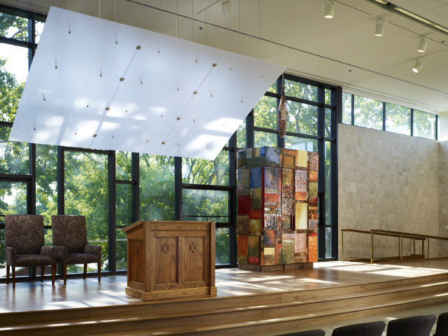 Offices, early childhood program, and chapel occupy the first floor; religious school and library are on the second floor; the sanctuary, social hall and kitchen are on the third floor, a strategy that allowed cost effective construction of high volume space for the sanctuary.