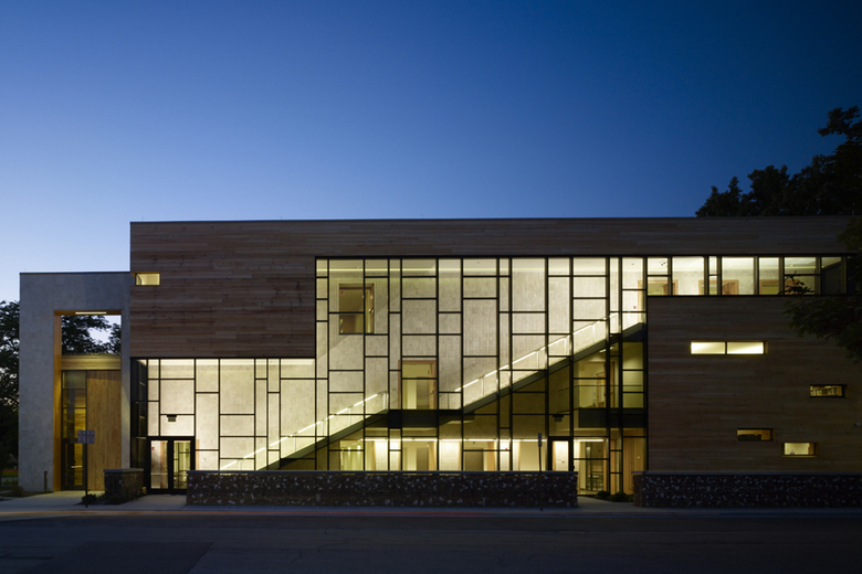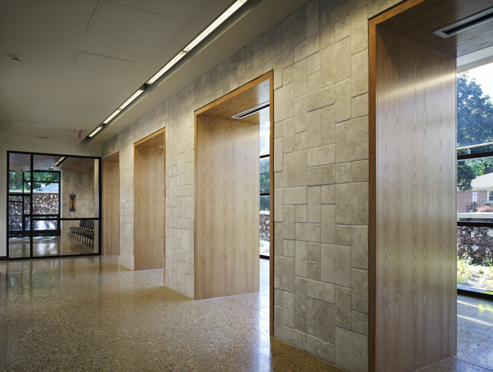 The solution, a precious wooden box, is a visual testament to these values. The wood cladding is recycled cypress harvested from demolished barns. The building makes a sustainable transition by using existing foundations and demolition spoils as engineered fill. Trees that could not be preserved were harvested for use within the building. Construction waste was placed in gabions and used to create site features. 40% of materials are regionally manufactured with Jerusalem Stone as the deliberate exception. The Jerusalem stone wall, representing less than 1% of the modest $230/sf cost, was included for its spiritual connection and anchors the box to create a baseline for all activities. The processional stair outside the wall provides a meaningful and eventful transition between spaces.