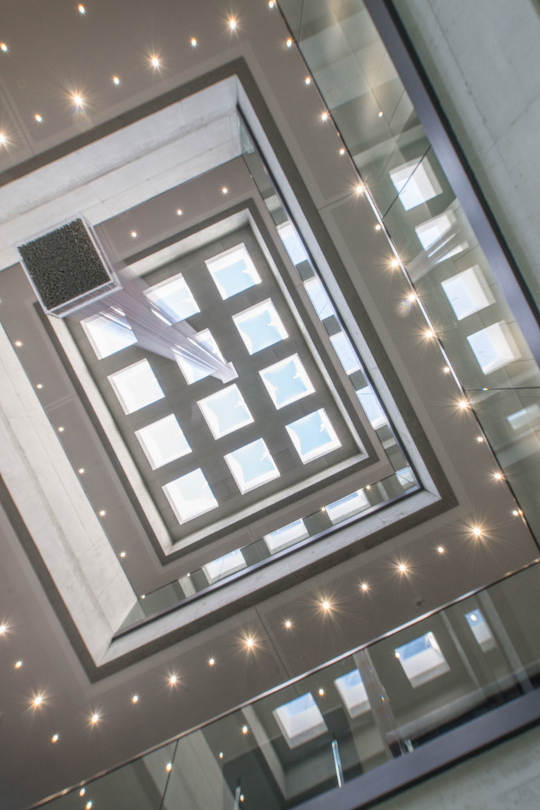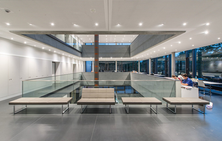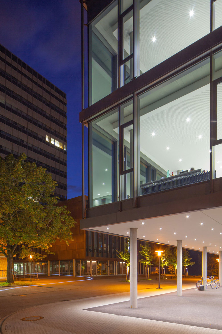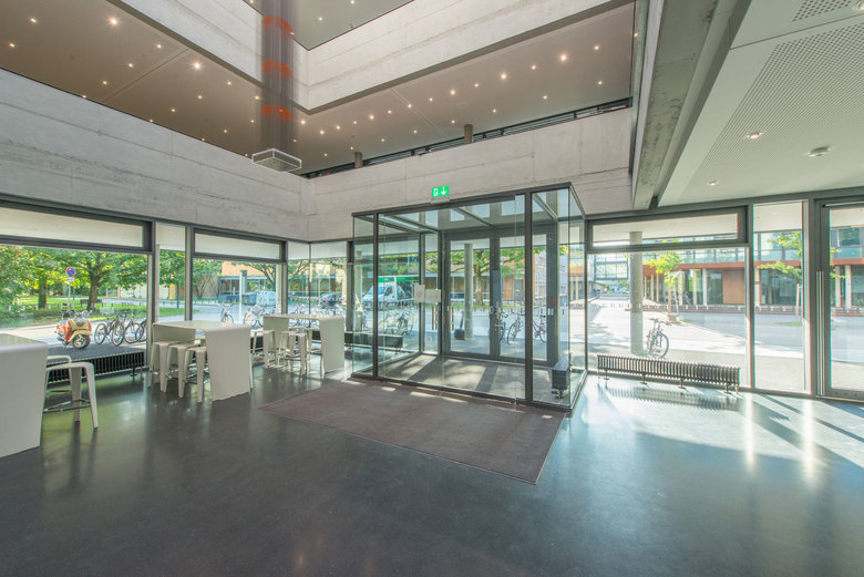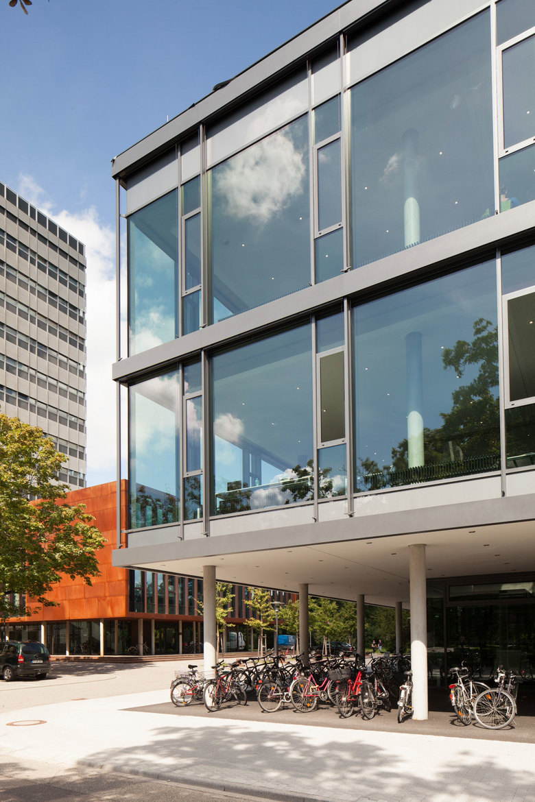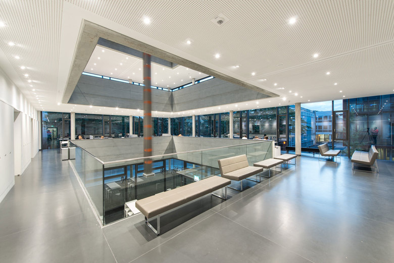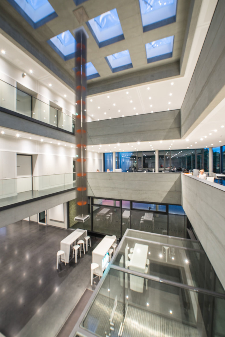 Technische Besonderheiten und Innovationen: Stahlbetonskelettbau mit weit gespannten, wandartigen Trägern über zwei Geschosse zur Erzielung der Stützenfreiheit im Atriumbereich, weit gespannte punkt- und linienförmig gestützten Stahlbetondecken ohne Unterzüge zur vereinfachten Installation der technischen Gebäudeausrüstung, Standsicherheitsnachweis für Erdbebenzone 1.