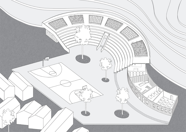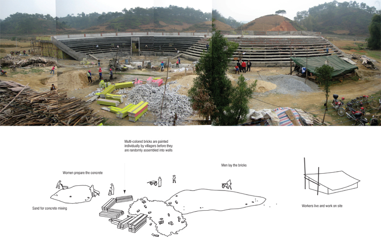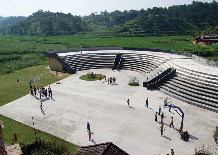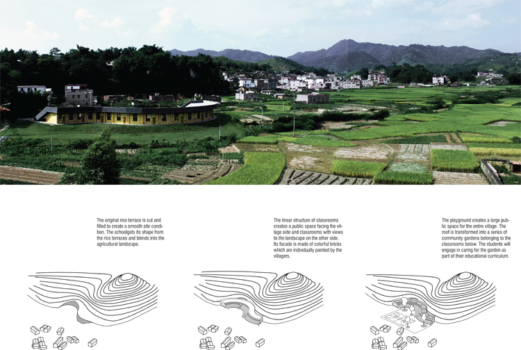 Initiated in 2006 as part of a design workshop to re-think the standard 3 story concrete buildings which are typically donated as schools in rural areas, the proposed design stressed sustainability and ecological responsibility. Designed to blend into the environment of farming terraces, the roof is also used as a community garden related to the classrooms below. The school itself takes shape through a process of cut and filled earth along an existing rice terrace. A continuous series of steps extends from the basketball court onto the roof creating a new public space in the village. The villagers participated by painting the individual bricks for the facade.