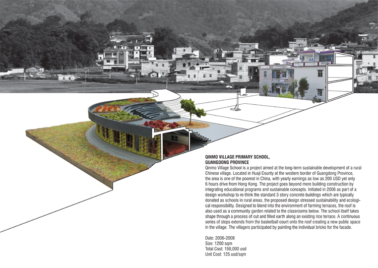 Qinmo Village Project is aimed at the long-term sustainable development of a rural Chinese village. The village itself traces its history back 300 years. However as a typical village in China, it is facing massive development and new 3-4 story concrete and tile buildings. Located in Huaji County at the western border of Guangdong Province, the area is one of the poorest in China, with yearly earnings as low as 200 USD yet only 6 hours drive from Hong Kong. The project goes beyond mere building construction by integrating educational programs and sustainable concepts. The construction project involves two buildings, the Qinmo Primary School and the Qinmo Community Center. The first is a new school designed to blend into the village landscape. The second is a project to renovate the old courtyard school building into a community center and demonstration eco household farm.