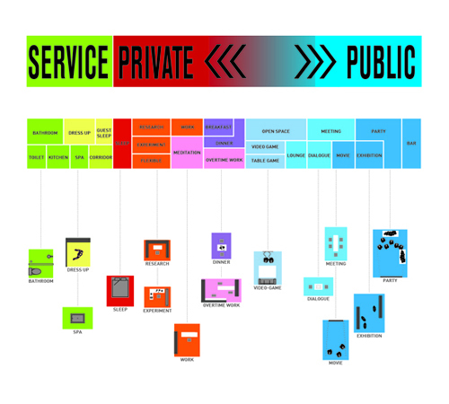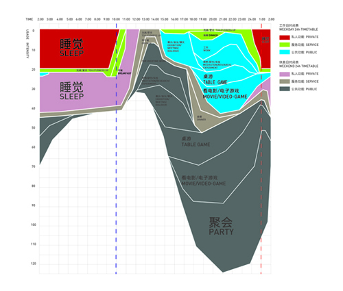 The UI is defined to reflect the actual density of human activities. The chart reveals the distribution pattern: The owner has such a lifestyle that it constantly swings between two extreme layouts of “public“ and “private“ . Every morning and night, private space functions primarily to accommodate individual activities such as sleeping/washing/ dining and working/reading/experiment/meditation; while in the afternoon, the room is transformed into an entire public space, especially on weekends. The owner and his friends enjoy in meeting, playing games and at times turning the apartment to a party place!