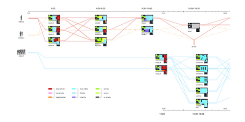 Moreover, the “sequence” has taken into account different scenarios of single user, double user and multi-user. Parallel (or cross) multiple trajectories was linked following different number of users. Even the same program, such as dining or watching movies, may result in different layout modes due to different occupancy.