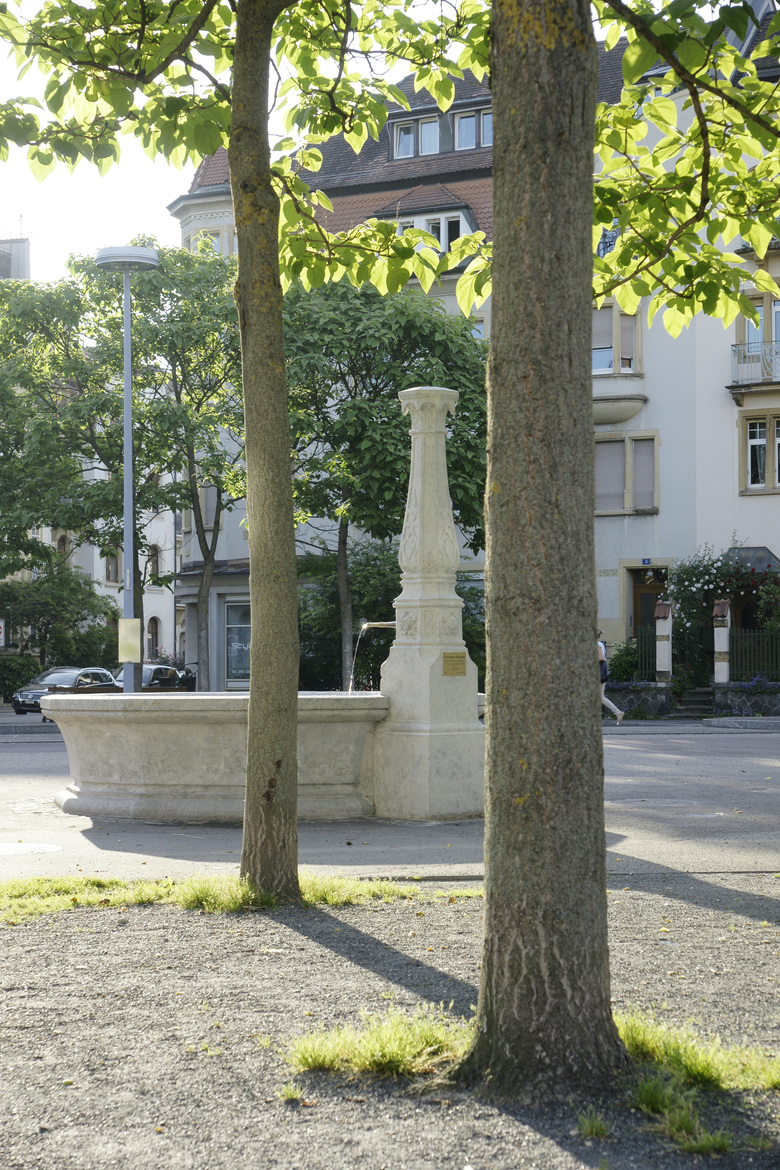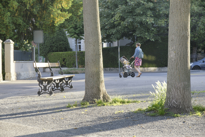 Zwei präzis gesetzte Paulowniengruppen stellen sich den einmündenden Quartierstrassen entgegen und bilden Aufenthaltsorte. Das Exotische und Eigenwillige der Paulownie kontrastiert die urbane Ausgestaltung des Rütimeyerplatzes.
