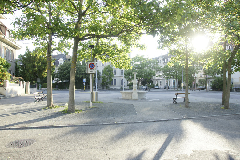 Seine Eigenart ist der grosszügige, nahezu unbegrünte Platzraum im Kontrast zu den umgebenden, üppig begrünten Blockrandbebauungen.