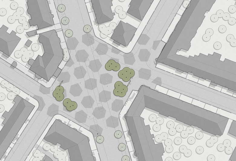Als prägendes Element wird die platzüberspannende Hartbelagsfläche neu formuliert. Ein differenziertes Oberflächemuster aus verschiedenen, flächengleichen Sechsecken verstärkt die Platzausdehnung.