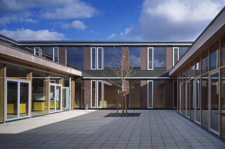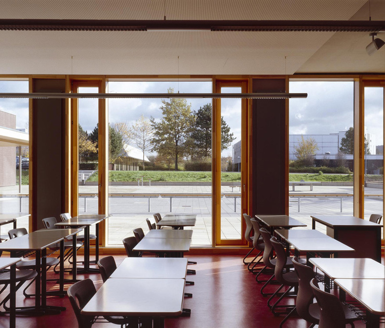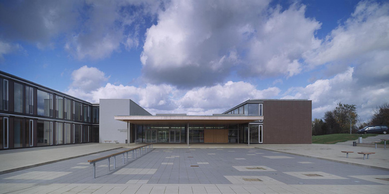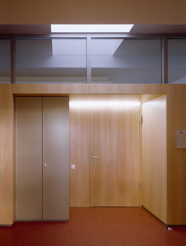 Die Transparenz zwischen Innen- und Außenraum ist Programm. Transparenz fördert Kommunikation, die Basis der schulischen Arbeit. Tageslicht, natürliche Werkstoffe, ruhige Farbigkeit und räumliche Klarheit machen das Gebäude zum unverwechselbaren Ort. Ein Ort, der Lehrern und Schülern die Möglichkeit zur Identifikation bietet, ein Ort der Identität schaffen kann. Die Glasfassade ist als Pfosten-Riegel-Konstruktion in Holz-Aluminium ausgeführt. Lüftungsflügel sind als Holz-Aluminium-Elemente in die Konstruktion eingesetzt. Geschlossene Faserzement-Paneele nehmen im Innenraum vertikal angeordnete Heizkörper auf. Der Sonnenschutz erfolgt über außenliegende Senkrechtmarkisen. Geschlossene Bereiche, zum Beispiel vor Wandschotten oder im Bereich der Treppenhäuser, sind mit mineralischer Dämmung und vorgehängten, hinterlüfteten Faserzementpaneelen verkleidet.