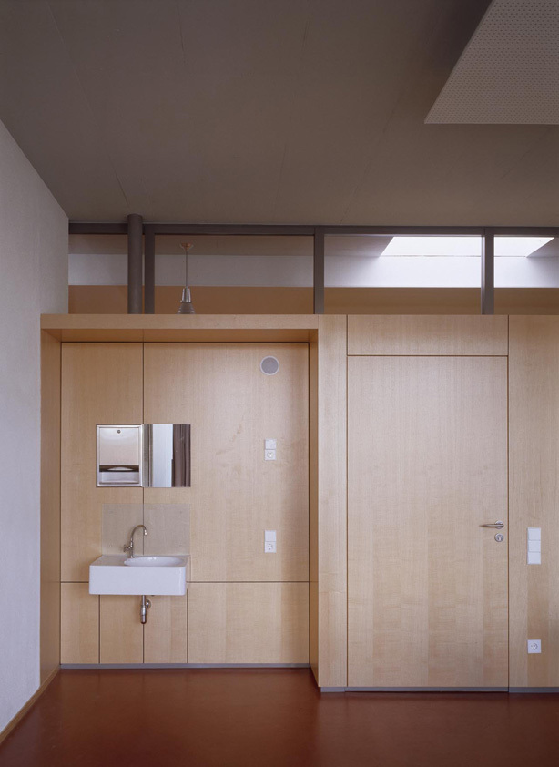 Der Baukörper bildet zur umgebenden Bebauung auf zwei Seiten eine klar definierte, schützende Raumkante und schließt an dieser Stelle das Ensemble öffentlicher Bauten ab. Zur angrenzenden Wohnbebauung entsteht eine klare Zäsur. Proportion und Höhe der vorhandenen Bauten werden im Grundsatz übernommen, jedoch im Detail präziser gefasst.