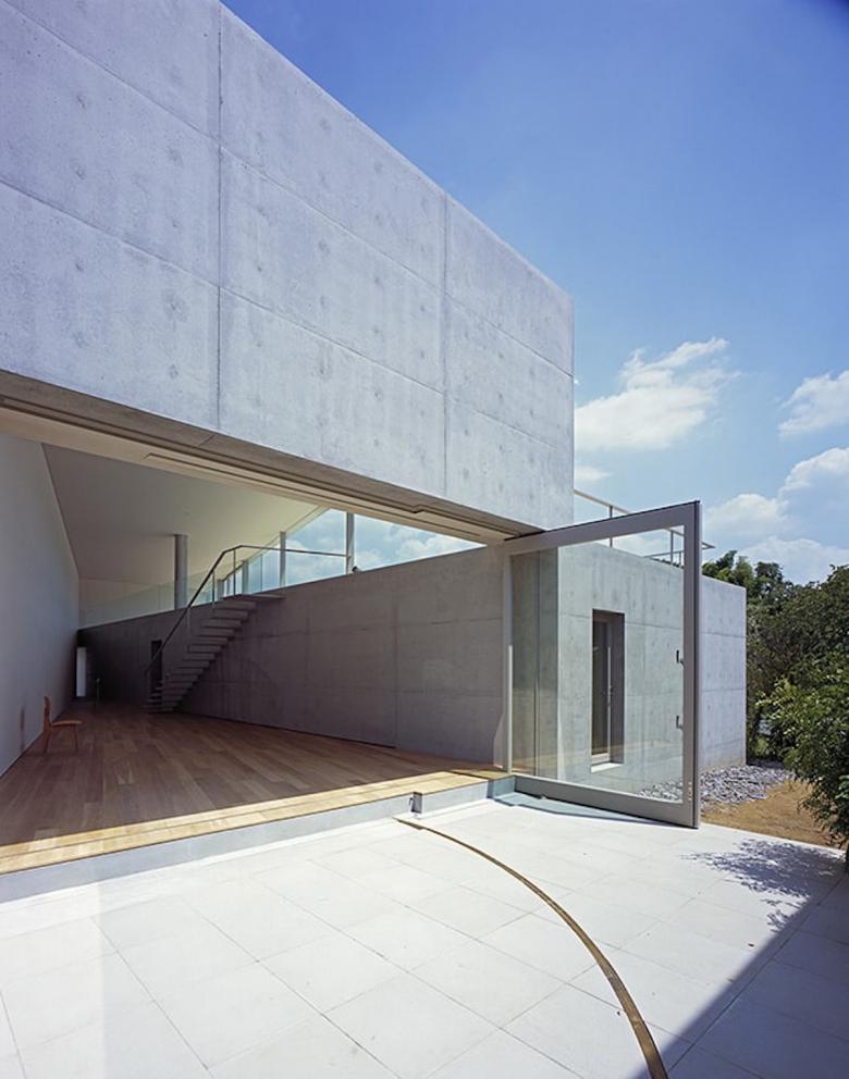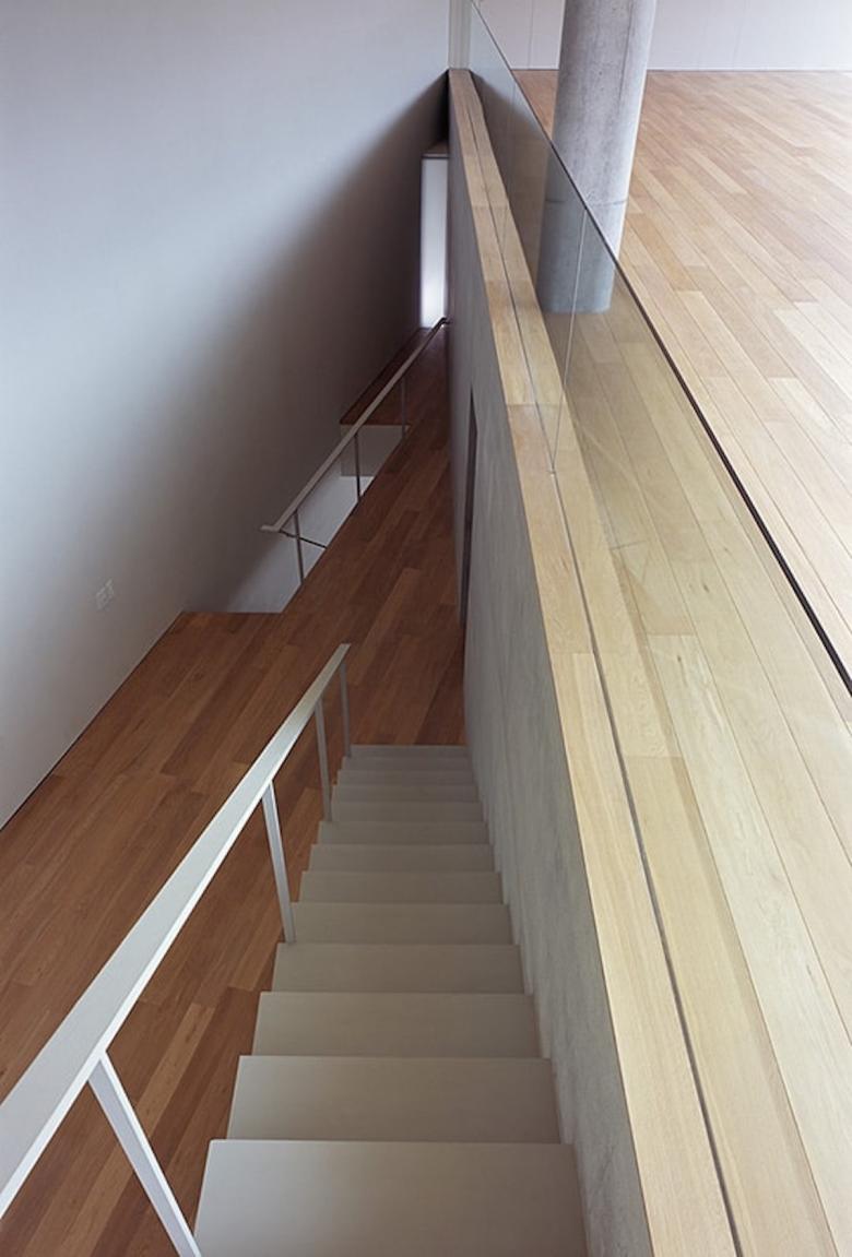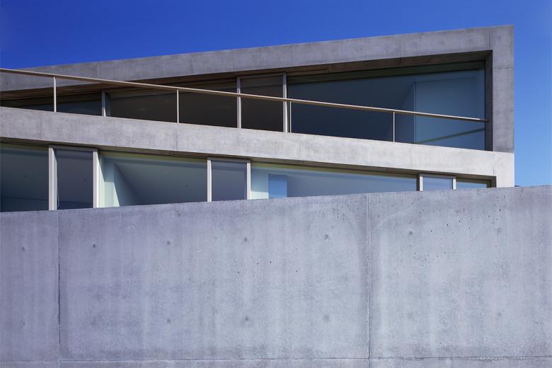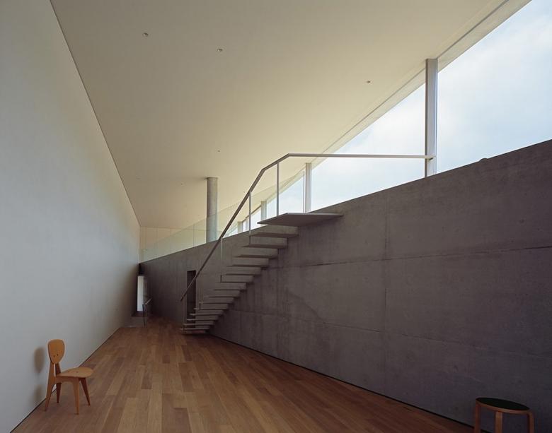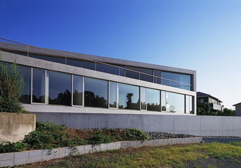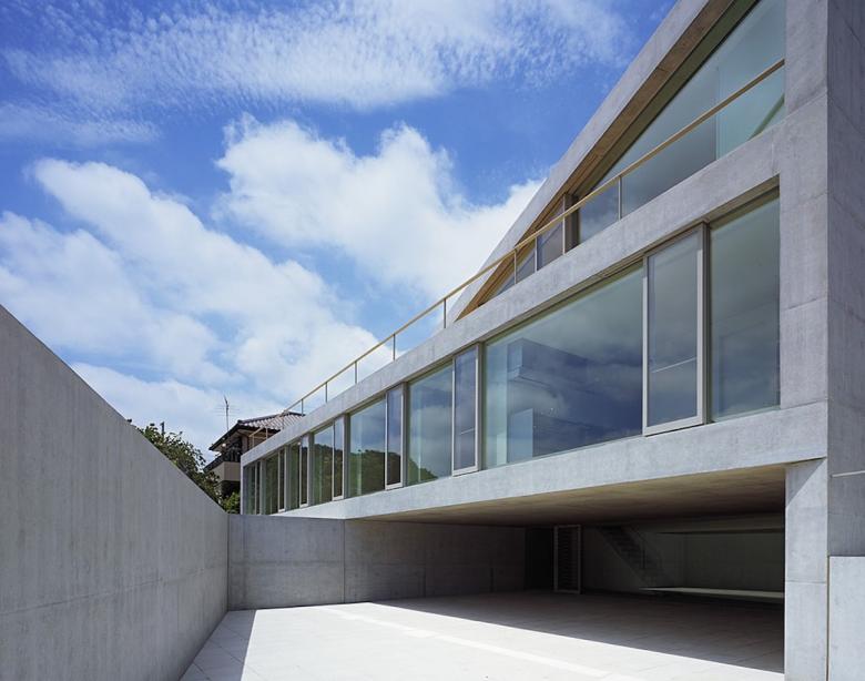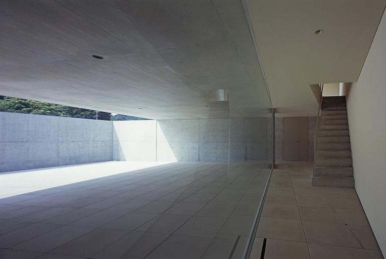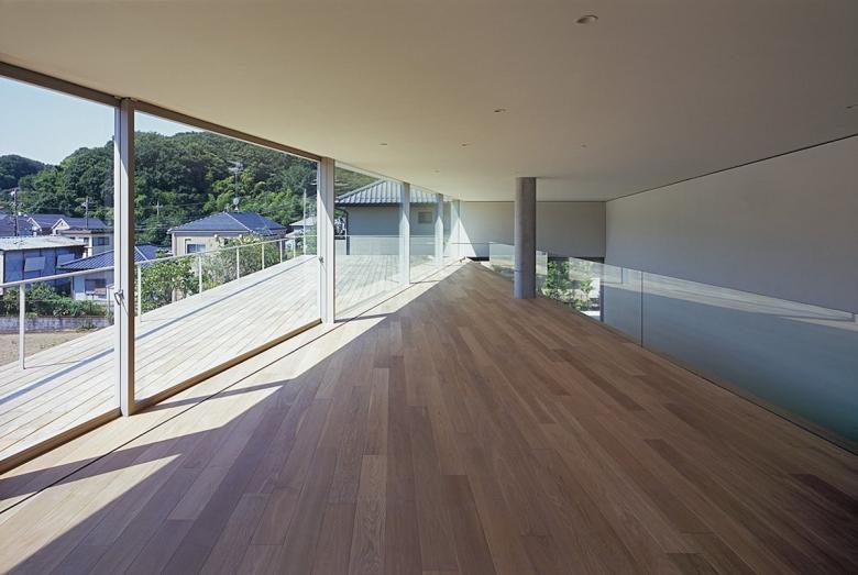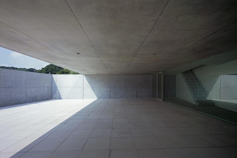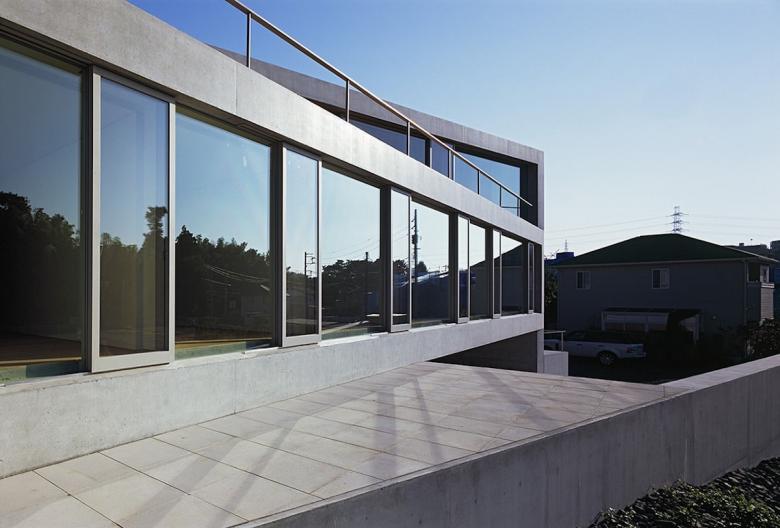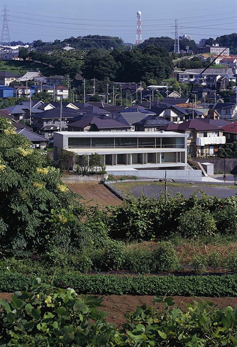 採用した建築的な操作は1つしかない。3m近い高低差のある斜面地形内に半ば埋もれた3層からなる直方体状のボリュームを、その短辺分だけシフトするというものだ。イタリックの「N」の様な形式は、将来にわたっても変わる事のない南側の里山へのビューを取り込み同時に大きなテラスを生み出しながら、今は駐車場や田畑として空地になってはいるが、近い将来、住宅が建て込んでくる事が予測される隣地からのオフセットを立体的にとる事で、将来的なプライバシーと採光を確保している。
