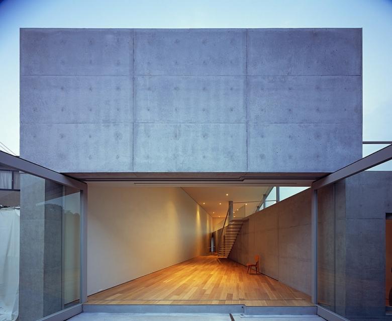 未来の都市環境への「構え」として採用された形式は、単にパッシブな外部要因への応答としてだけではなく、自律的な空間展開をも生み出している。シフトによって発生した2層分の吹き抜け空間には、南側の居室群を内包するボリューム越しの自然光が、2階床や天井でバウンドしながら届くことで、そのボリュームによる隔たりと合わせて、騒然と発達する外部からの「奥性」を生み出し、住環境にケイブのような落ち着きを与えている。同時に「流動/滞留」の空間配分もまた、斜めにスラッシュする軸線によって規定され、幾何学上ちょうどくびれた部分が移動空間に、幅広な部分が滞留空間となり、直角に突き当たることのない動線がそれらを滑らかに接続することで、自然で変化のあるシークエンスが生活経験に仕込まれることにもなった。