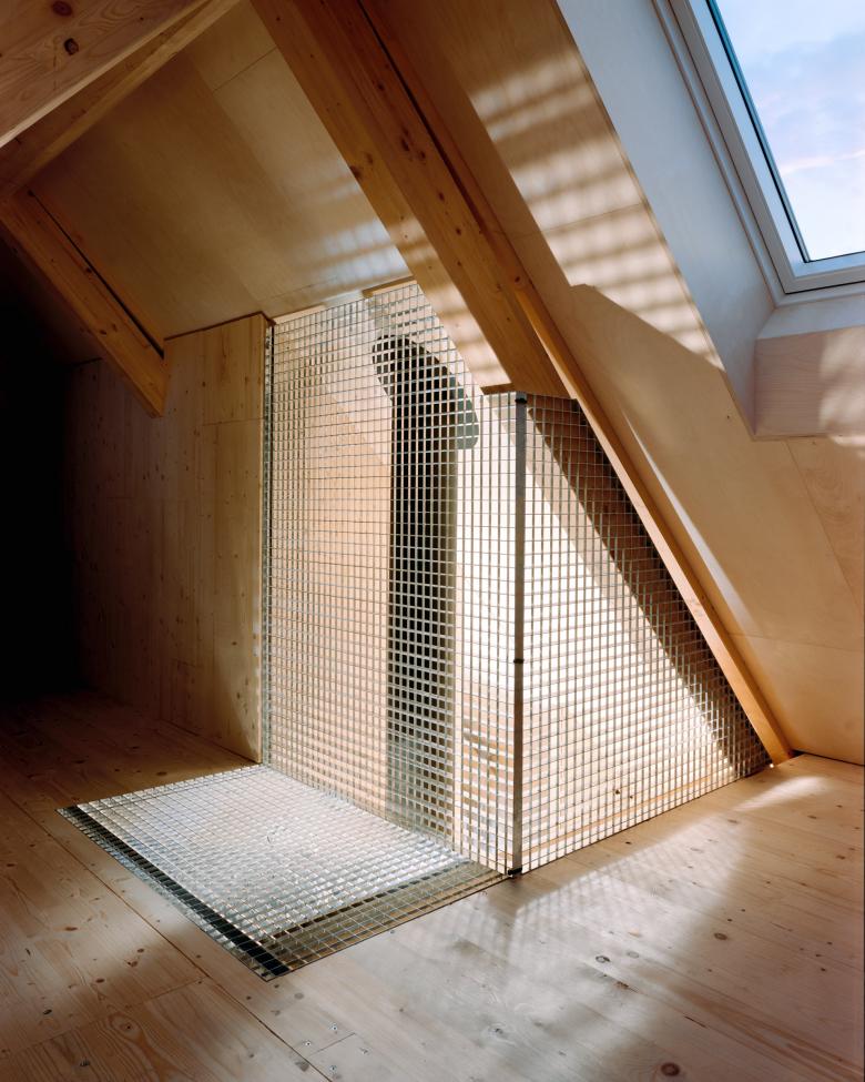 Im Untergeschoss liegt ein im Volumen versetzter Werkraum der mit Oblichter das Holzhaus darüber erspähen lässt. Die Verbindung vom Untergeschoss hinauf in das Erdgeschoss läuft über denselben inneren offenen Treppenraum.