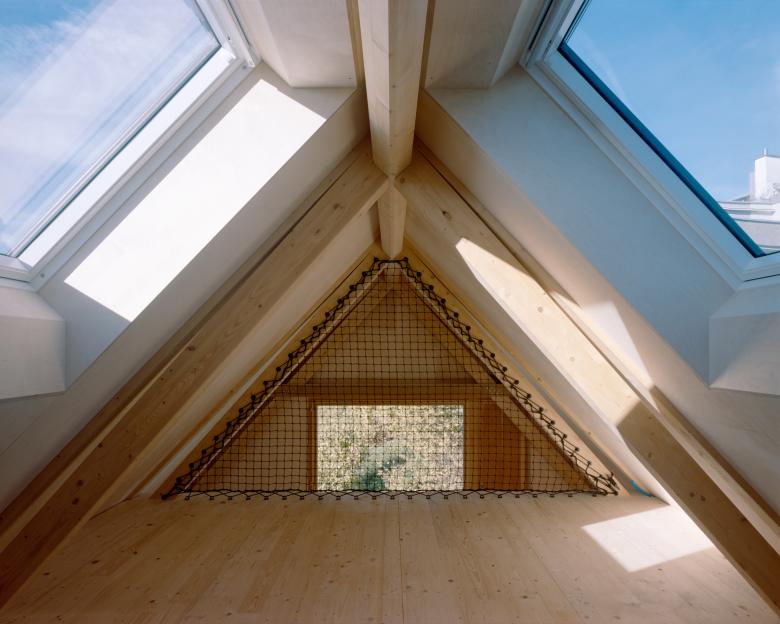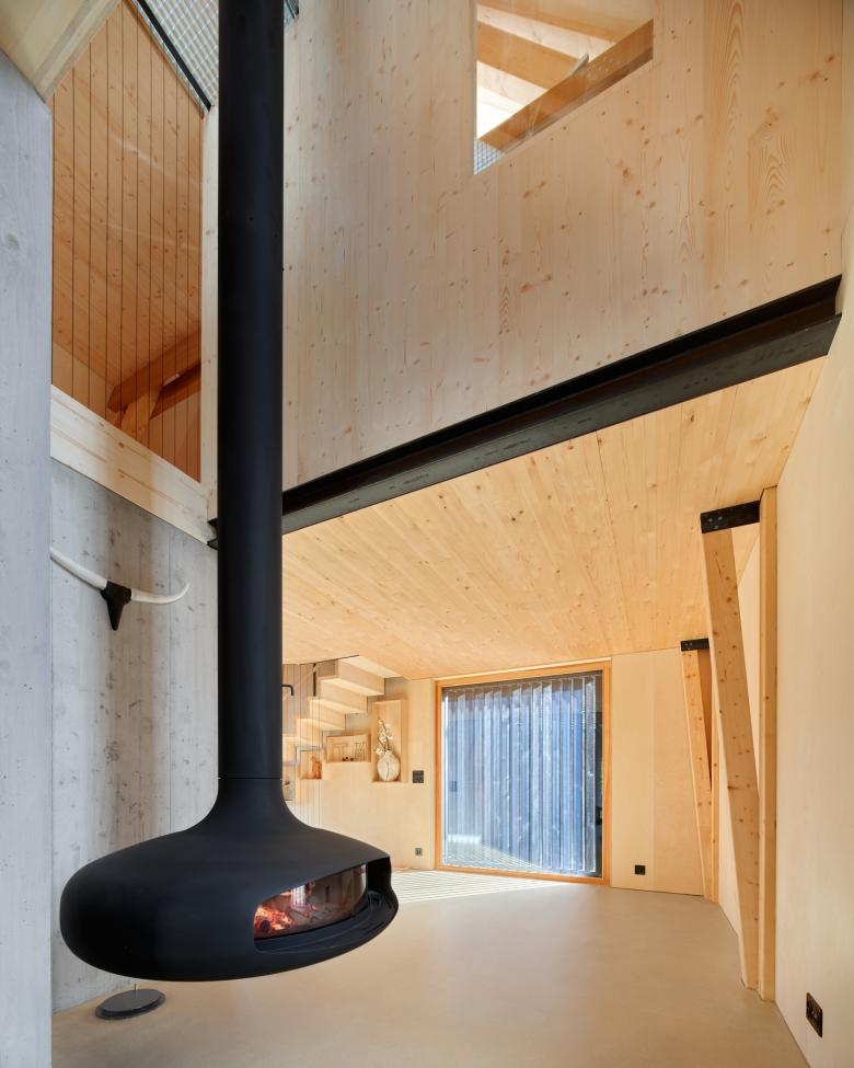 In eine bestehende Scheune aus dem Jahr um 1850 herum, wird eine neue, äußerst filigrane, Tragstruktur aus Holz eingebaut. Diese stützt die bestehende Holtragstruktur während der Bauphase und wird später sichtbar bleiben um die Raumgliederung vorzugeben. Vertikale und horizontale Scheiben stabilisieren die Holzstruktur und generieren mit ihren verschiedenen Öffnungen die Räume und ihre Abfolgen. Durch die drei Stockwerke hindurch sind diese Nischen nun offen miteinander verbunden und generieren zusammen einen einzigen großen Lebensraum vom Erdgeschoss bis unter das Dach.