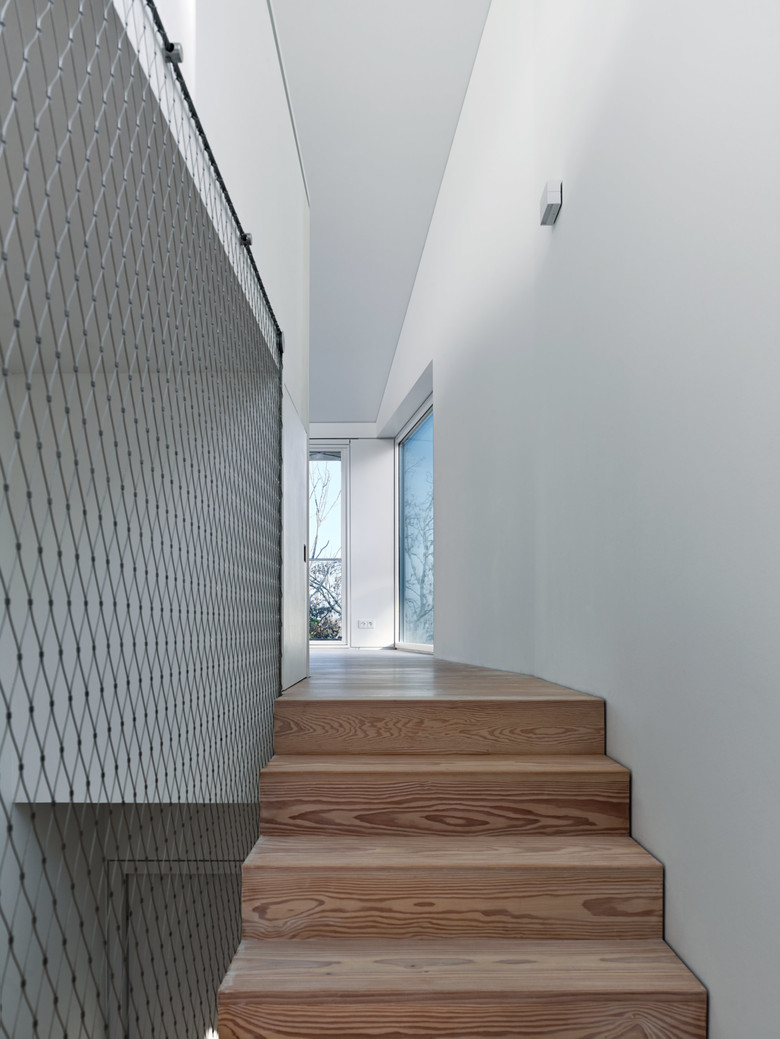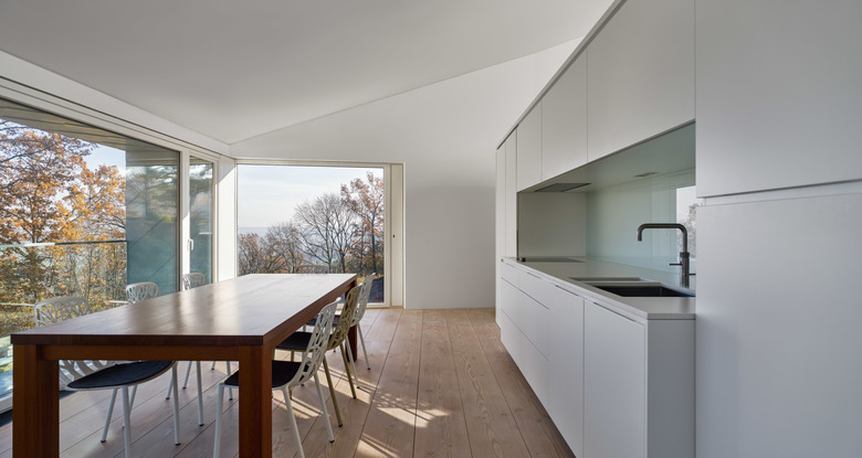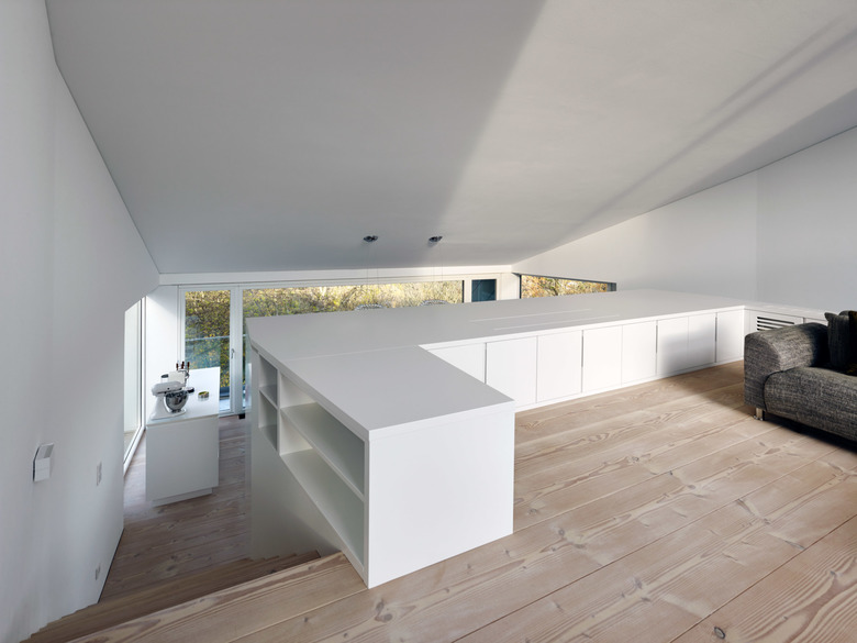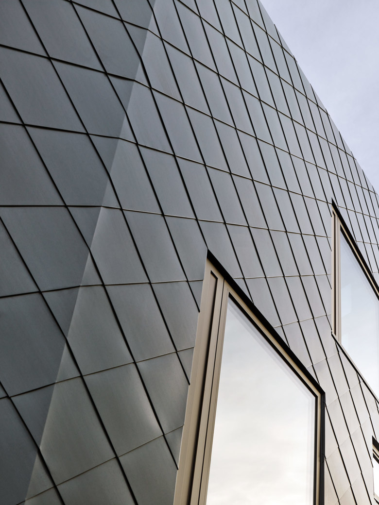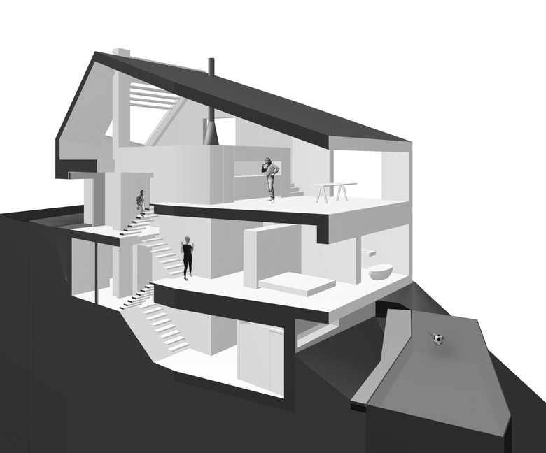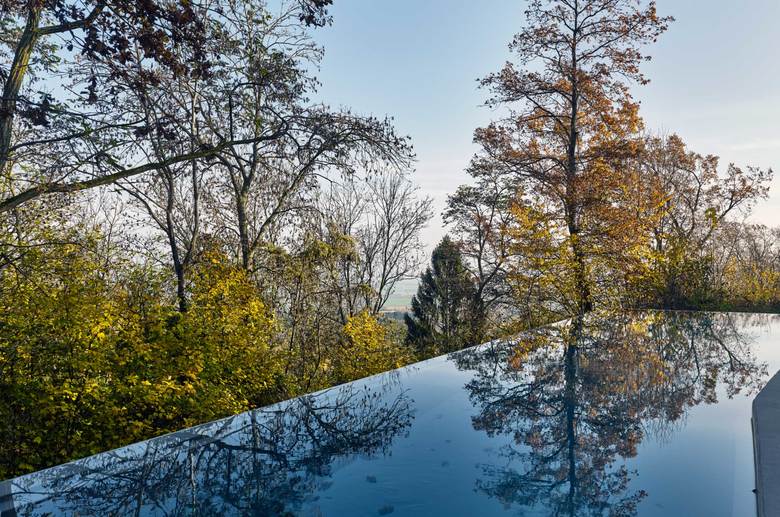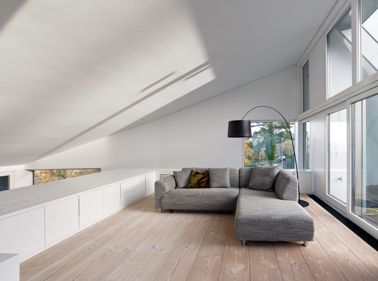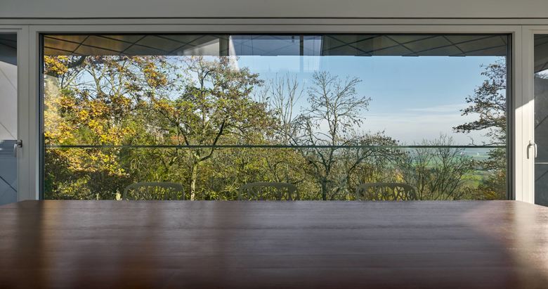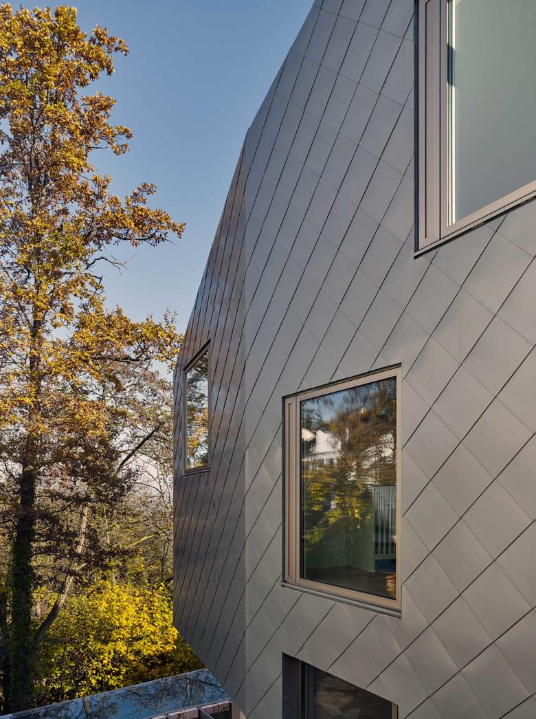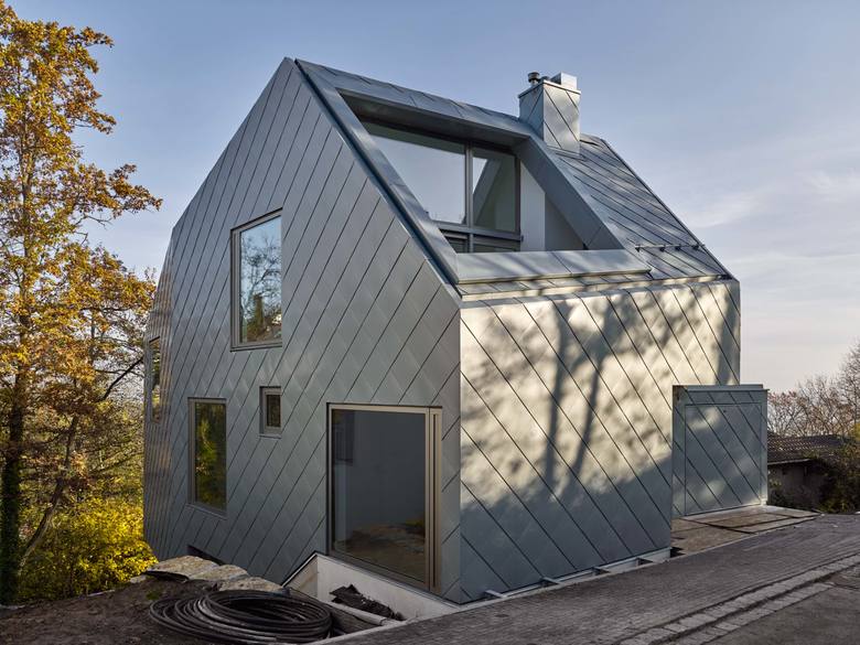 An einem steilen Nordhang des dicht bebauten Stuttgarter Vorortes Leonberg gelegen schöpft das Einfamilienhaus alle Potentiale der Lage und Topographie aus, um ein Maximum an Wohnqualität zu erreichen. Dem folgt die äußere Gestalt, die sich durch einen einheitlich mit Blech verkleideten und großen Öffnungen versehenen prismatischen Baukörper präsentiert. Durch die versetzten Geschosse der Split-Level-Konstruktion entstehen terrassenartige Situationen, die die Besonderheit des Wohnens am Hang zum Inhalt haben. Der großartige Blick in die Natur folgt der Richtung des Sonnenlichtes, welches das Herbstlaub der Bäume zum Leuchten bringt.