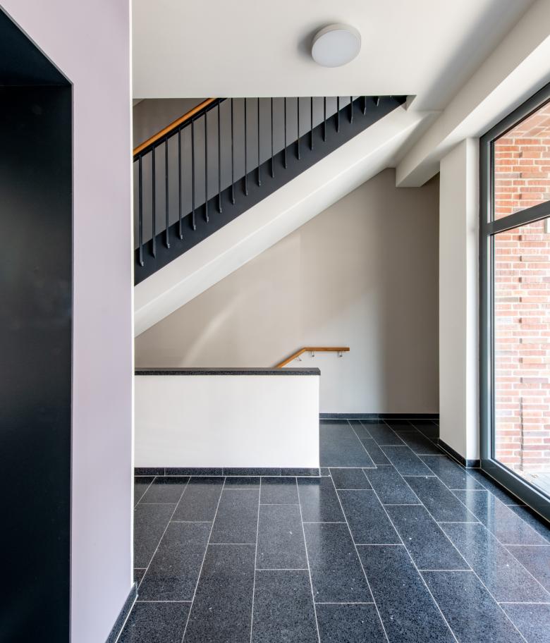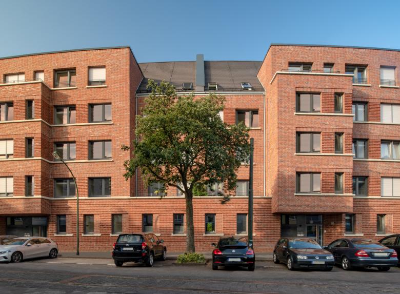 Der Neubau des Gebäudeensembles orientiert sich in seiner Form und Materialität am vormaligen Bestandsgebäude. Mit seiner differenzierten Höhenentwicklung, die zwischen drei und fünf Vollgeschossen variiert, dem langgestreckten Satteldach und den Treppengiebeln an den niedrigeren Kopfseiten reagiert der Baukörper auf die unterschiedlichen Dimensionen des städtischen Kontexts. Die Fassade ist über die gesamte Länge mit Risaliten und Erkern gegliedert und rhythmisiert. Versetzt angeordnete Klinkerlagen im Sockelbereich und die Grenadierschicht über den Fenstern unterstreichen die Plastizität der Fassade. Die Eingänge an der Straße befinden sich jeweils unter den Vorsprüngen der Erker, sind leicht zurückversetzt und durch eine schräge Wandfläche betont. Nach Süden wird das Haupthaus entlang beider Seiten um zwei separate Wohnhäuser ergänzt. Der Klinkersockel stellt die Verbindung zum Haupthaus her. Insgesamt entstehen 62 Genossenschaftswohnungen.