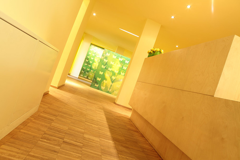 Arztbesuche können auch Spaß machen - das beweist diese erweiterte Kinderarztpraxis in Düsseldorf. fröhliches grün und gelb, kombiniert mit dem hellen Holzton von Ahornmöbeln und warmem, gedämpftem Licht schaffen eine besondere Atmosphäre, die Kindern Geborgenheit vermitteln und zugleich ihre Phantasie anregen soll. Unverwechselbares Element in den gestalteten Räumen: das großformatige Motiv des „Schmetterlingskinds“ auf Wandelementen und Garderobe. Leitgedanke beim Umbau der Praxis war, in die Welt der Kinder einzutauchen. Das innenarchitektonische Konzept will Leichtigkeit vermitteln, Verspieltheit, Heiterkeit. Die Räumlichkeiten sind „wie aus einem Guss“ gestaltet, wobei die individuell gefertigten Möbel verschiedene räumliche Bezüge und Ordnung herstellen. So ist es gelungen, Kindern und Eltern ein unverwechselbares Raumerlebnis zu verschaffen. Steril wirkende Wandflächen wurden mit dekorativem Hpl zu neuem Leben erweckt – so können sogar Arztbesuche Spaß machen.