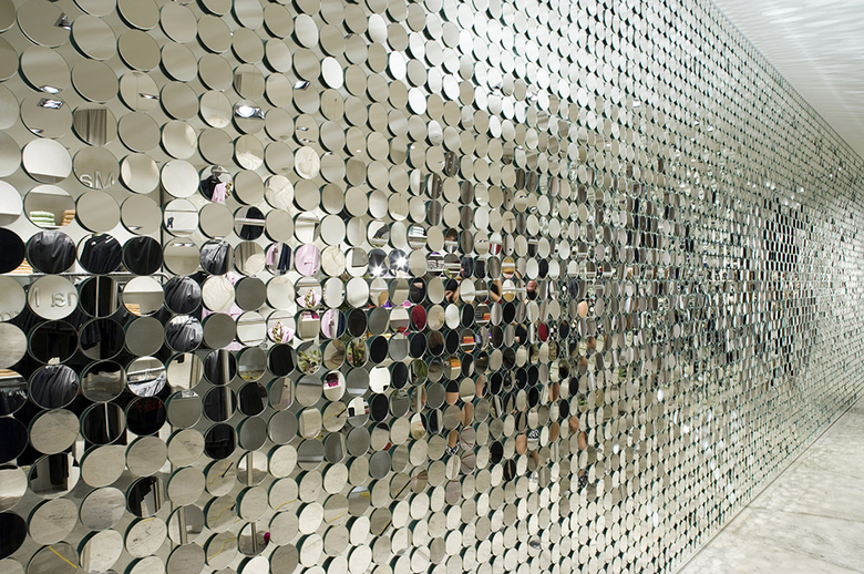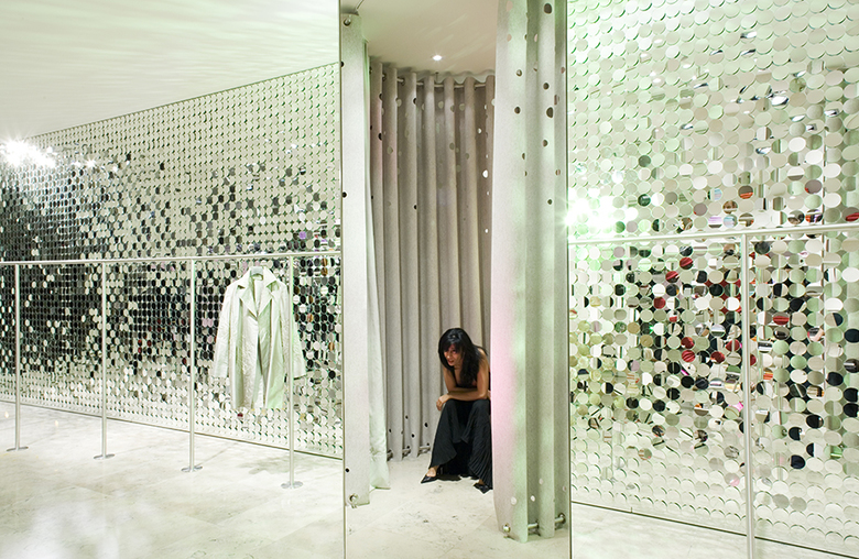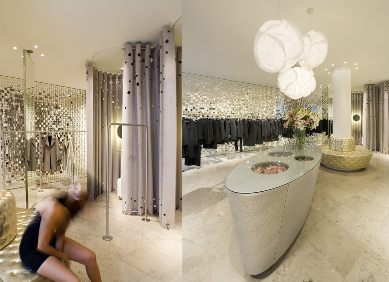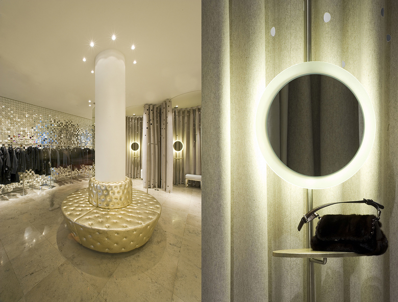 Der neue Store von Irma Mahnel, einem exklusiven Mode- Label für große Größen, ist ein Crossover von Ausstellung, Installation und Retail. Der Look ist vom Kunden inspiriert, der die Sinnlichkeit des weiblichen Körpers in Kleidung hervorhebt, die Kurven betont. Infolgedessen ist die Atmosphäre hier funkelnd, kurvenreich und glamourös. Die Materialität wirkt nicht statisch, sondern haftet an den Wänden, wächst aus Winkeln hervor, durchspringt den Raum und überflutet diese neue Zone. Tausende von Reflexionen in einer Collage von kreisförmigen Spiegeln an der Wand zeigen fragmentierte Bilder. Die Umkleidekabinen sind zentral mittig positioniert. Hier wird der Kunde zum Star der Show und bekommt dadurch besondere Aufmerksamkeit.