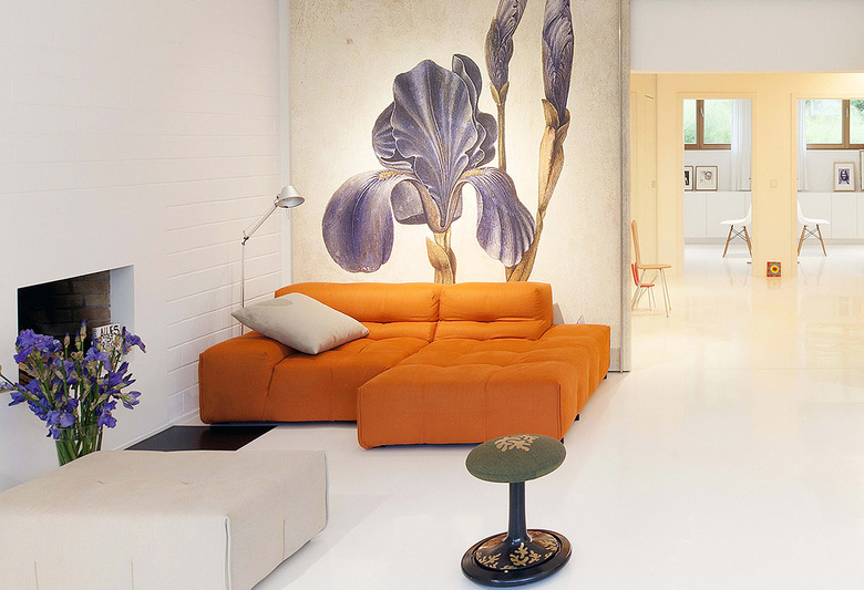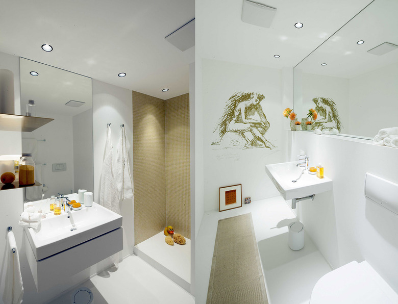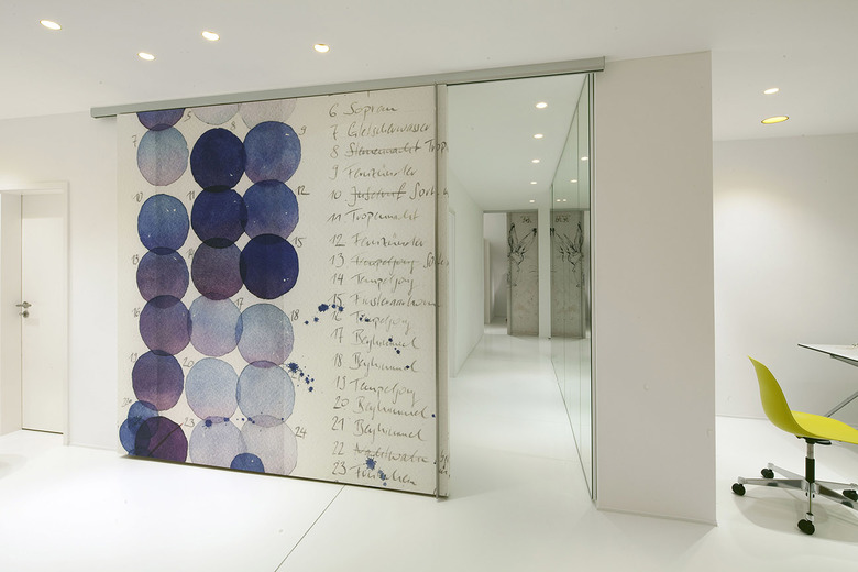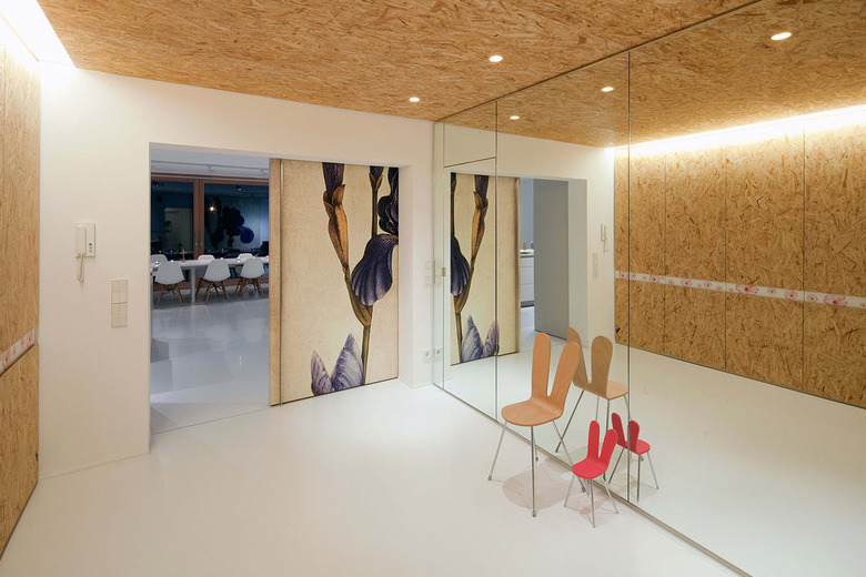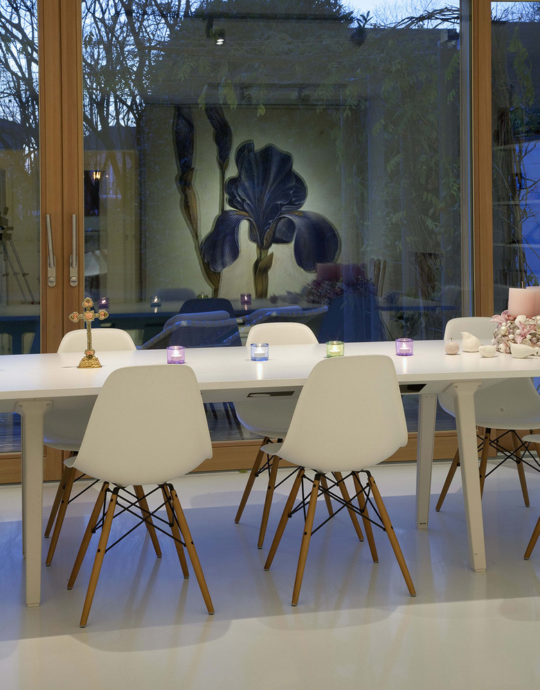 Architektur ist eine Kunst des Hintergrunds...des Fühlens und Empfindens... Wenn sie berührt gelingt ihr, dass die Bewohner sich wohlfühlen. Neben Ratio, technischer Raffinesse und Funktionalität ist die Atmosphäre und die Empfindung wichtig. Eine Architektur, die alle Sinne reizt. Dafür ist die Auswahl der Materialien, der Oberflächen, des Lichtes und der Farben von Bedeutung. Hier diente das Wunderblau des Rittersporns als Symbol für die Endlichkeit, strahlend und sanftmütig. Im Haus von Marieposella spielen Helligkeit, Langlebigkeit, Reinheit, Nachhaltigkeit und die Gesetze der Farbenlehre eine Rolle. Durch den Einsatz von verschiedenen Holzoberflächen wird die Natur in den Raum transferiert und erhält einen warmen Charakter. Wo keine räumliche Weite herrscht, helfen Spiegel für die optische Illusion. Blume ist nicht gleich Blume. Gänseblümchen und Lilienblüten sind nicht wie ein Strauss Blumen in der Vase zusammengebunden, sondern erscheinen wie bei Alice im Wunderland, mal überdimensional groß auf der Schiebewand oder in Farbbändern an der Garderobe.