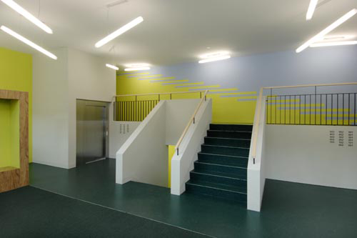 Das neue, 6-geschossige Gebäude mit Attika und Kellergeschoss wird über eine grosszügige Eingangshalle erschlossen. Die Halle verbindet die zwei Vertikal-Erschliessungen. Die Beschränkung auf nur einen Haupteingang trägt zur Identifikation der BewohnerInnen mit ihrem Haus bei. Die Eingangshalle kann so auch zum Treffpunkt werden.
