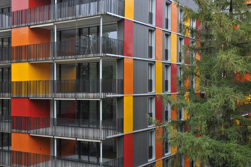 Die in drei Farben ausgeführten Schiebeläden verleihen dem Gebäude seine unverkennbare Identität.