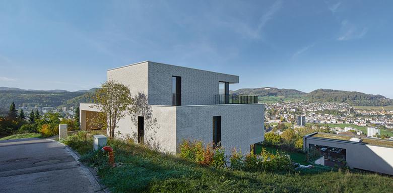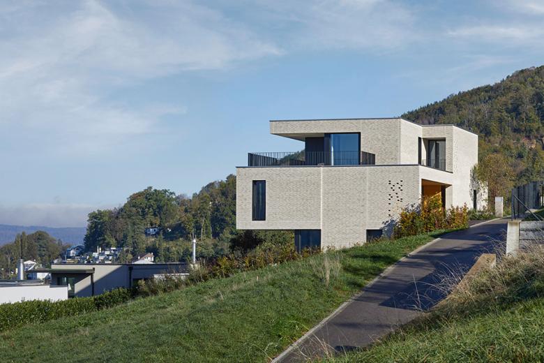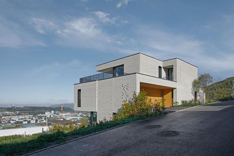 Die eindrückliche Aussicht in die Rheinebene zu den Vogesen und das Ergolztal bestimmen die Ausrichtung der Räume. Sockel-, Erdgeschoss und Attika können dank der Neigung des Hangs davon profitieren. Die drei Geschosse sind durch eine durchlaufende Eingangshalle miteinander verbunden.