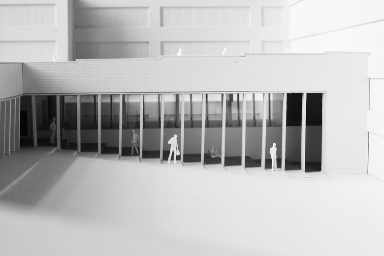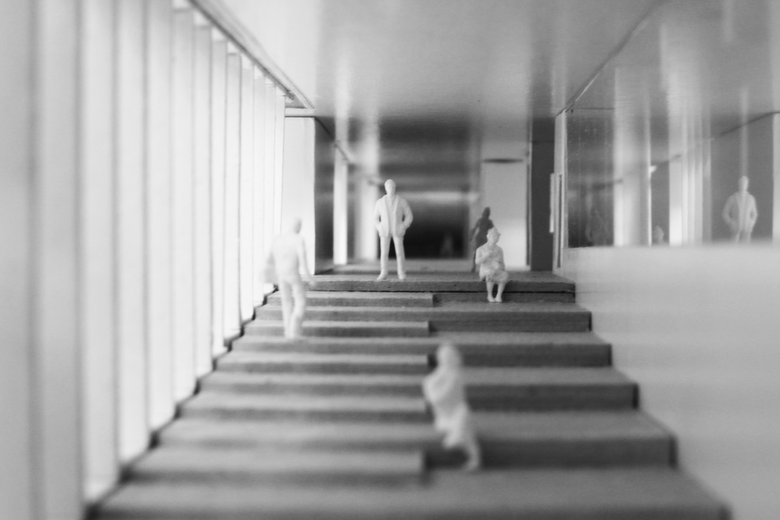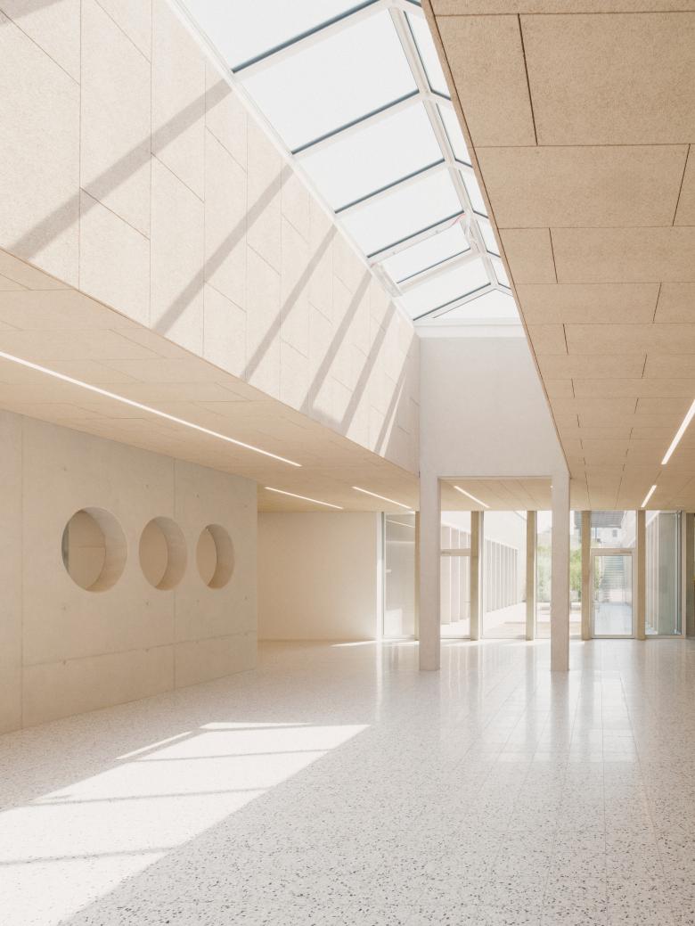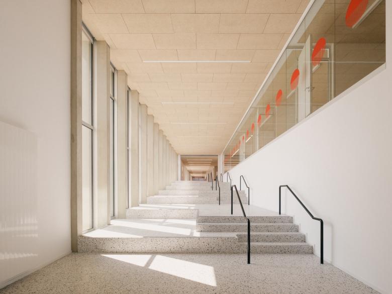 Verzahnen & bündeln: Ein neuer zentraler Eingang gibt dem Schulzentrum einen Mittelpunkt, genauso wie die dominante Magistrale, die alle Gebäudeteile zusammenfasst. Die zentrale Magistrale mit latenten Bezug zum Außenraum ist das Herz des neuen Ensembles. Sie verbindet Realschule mit Gynmasium und deren gemeinsame Räume wie die Mensa, die Bibliothek und das Selbstlernzentrum. Von ihr gelangt man in die flexibel adaptierbaren Klassenräume. Sie ist großzügig und hell und von einer breiten Treppe dominiert. Sie ist nicht nur als Transfer-, sondern auch als Begegnungs- und Aufenthaltsraum angelegt.