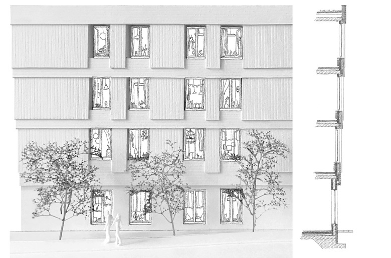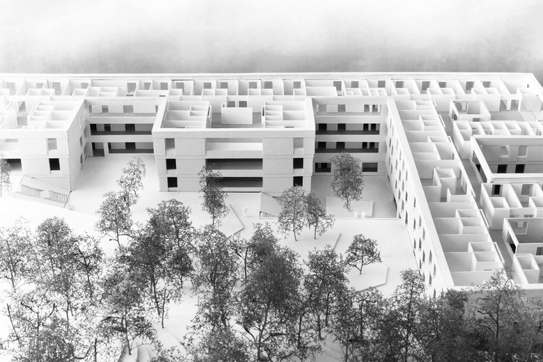 Der viergeschossige Baukörper mit Flachdach wird winkelförmig in den Hang eingebettet. Durch das starke Gefälle des Hanges ragen die einzelnen Gebäudeteile je nach Orientierung und Lage zwei- und dreigeschossig (süd- und westseitig zum Park hin) bis viergeschossig (nord- und ostseitig, zur Stadt hin) aus der Landschaft. Auf eine Unterkellerung kann durch die Vielzahl an zum Hang gelegenen unbelichteten Räumen im Erdgeschoss und westseitig sogar im 1. Obergeschoss (Lagerräume Küche) verzichtet werden.