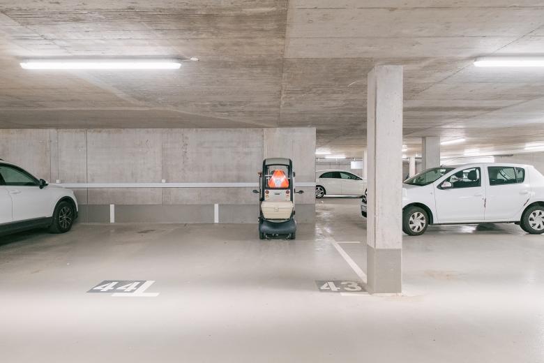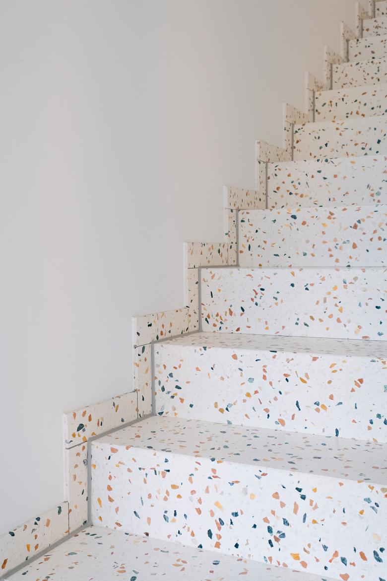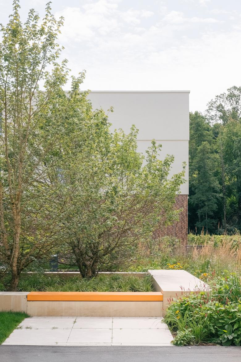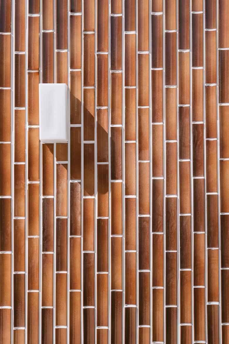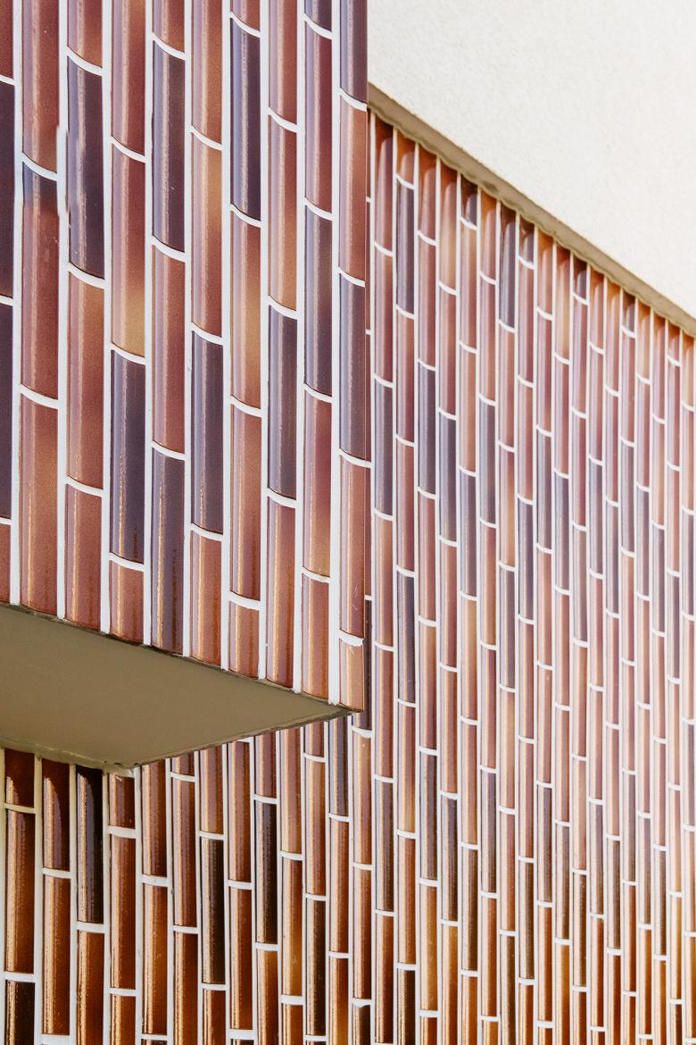 Das Gebäude charakterisiert eine Bandfassade mit robusten Brüstungs- und Sturzbändern, sowie drei unterschiedlich breiten Fenstertypen, die auf die jeweilige Nutzung Bezug nehmen. Die Fassadenkeramik ist bewusst robust und tritt mit seinen Braun- und Ockertönen in Dialog mit dem Grün rundherum. Die Fliesen sind konkav geformt und wirken dadurch lebendig und warm.