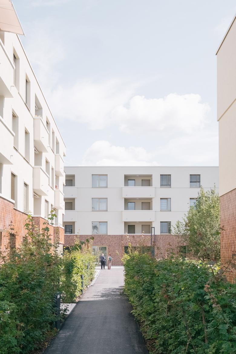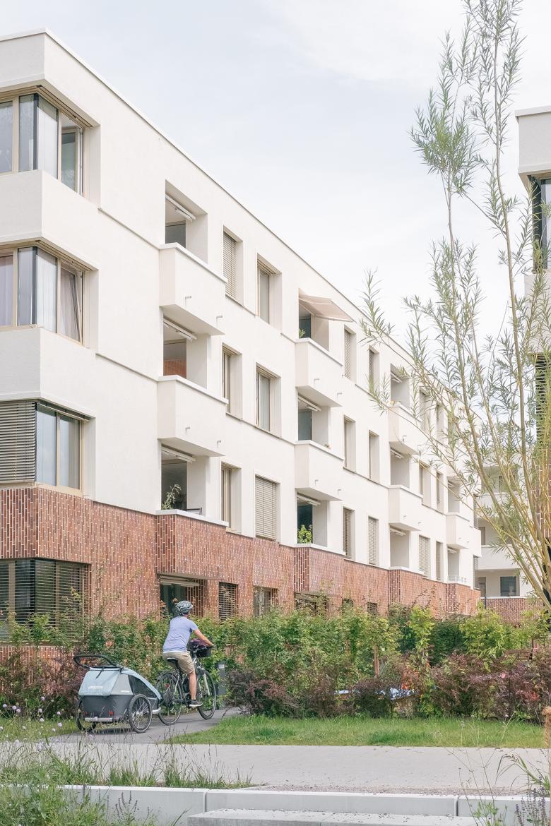 „Jeweils zwei Wohnungen sind über eine Loggia erschlossen, was die Kommunikation zwischen den NachbarInnen belebt. Im Innenhof werden subtil Privat- und Gemeinschaftsflächen ohne Zäune mit einem Baumhain und Sitzgelegenheiten getrennt.“