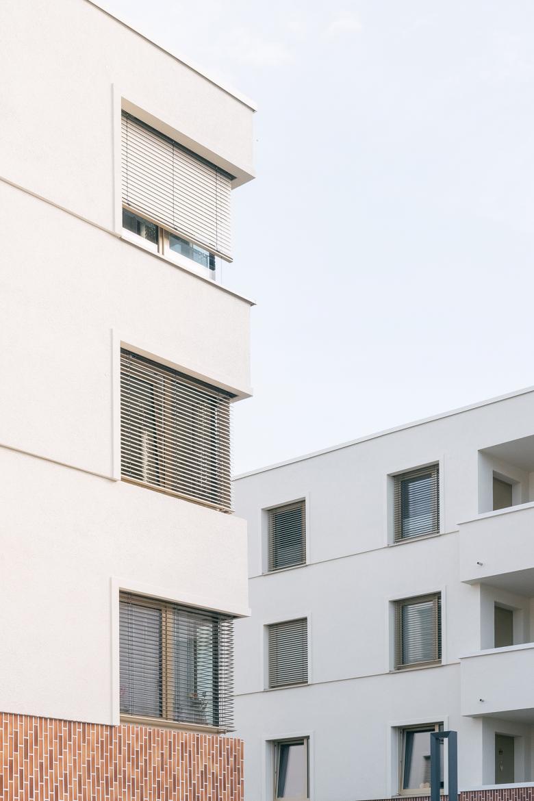 „Die Fassadenvorsprünge und Balkonbrüstungen gliedern die Fassade horizontal. Die Sockelzonen der Wohnbauten sind mit Keramikkacheln in changierenden Brauntönen verfliest. Sie fassen das Ensemble und geben ihm seinen einladenden, heimeligen Charakter.“