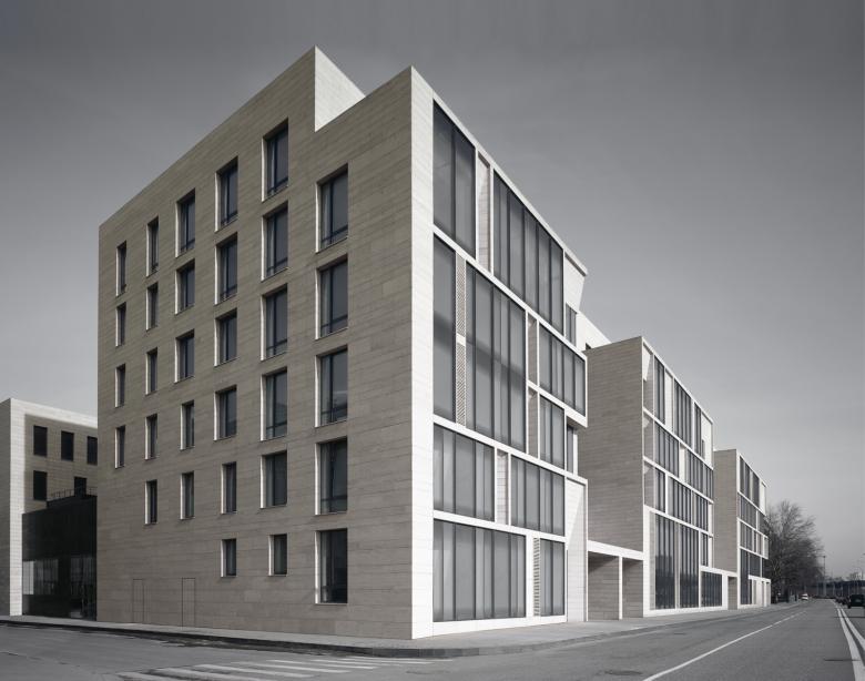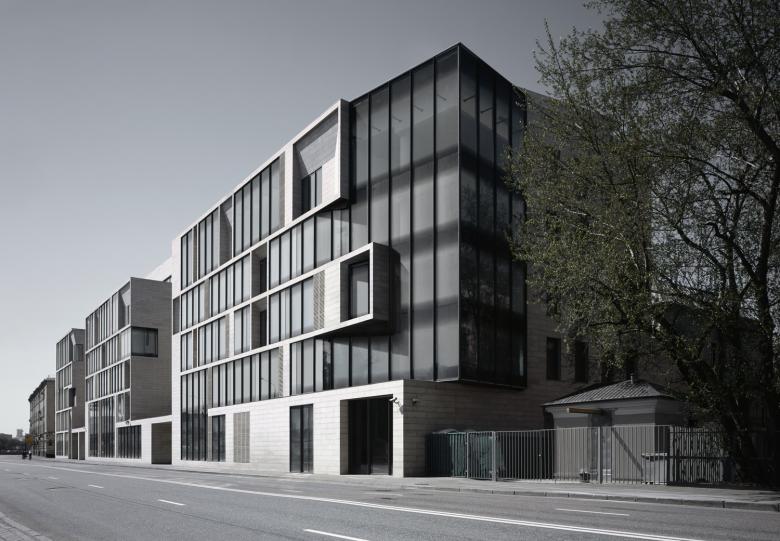 External finishing (façade) is covered with light-shade Jurassic stones with surface treated in three different types, plus differently shaded and toned glass in dark-grey aluminum frames. The idea of the embankment façade was to make an impression of balconies, loggias, ventilation grids and other architectural details sprout through glass surfaces of different transparency. These details serve as a link to the more classic facades of the nearby buildings, especially on the other side of the complex (Kursovoy pereulok).