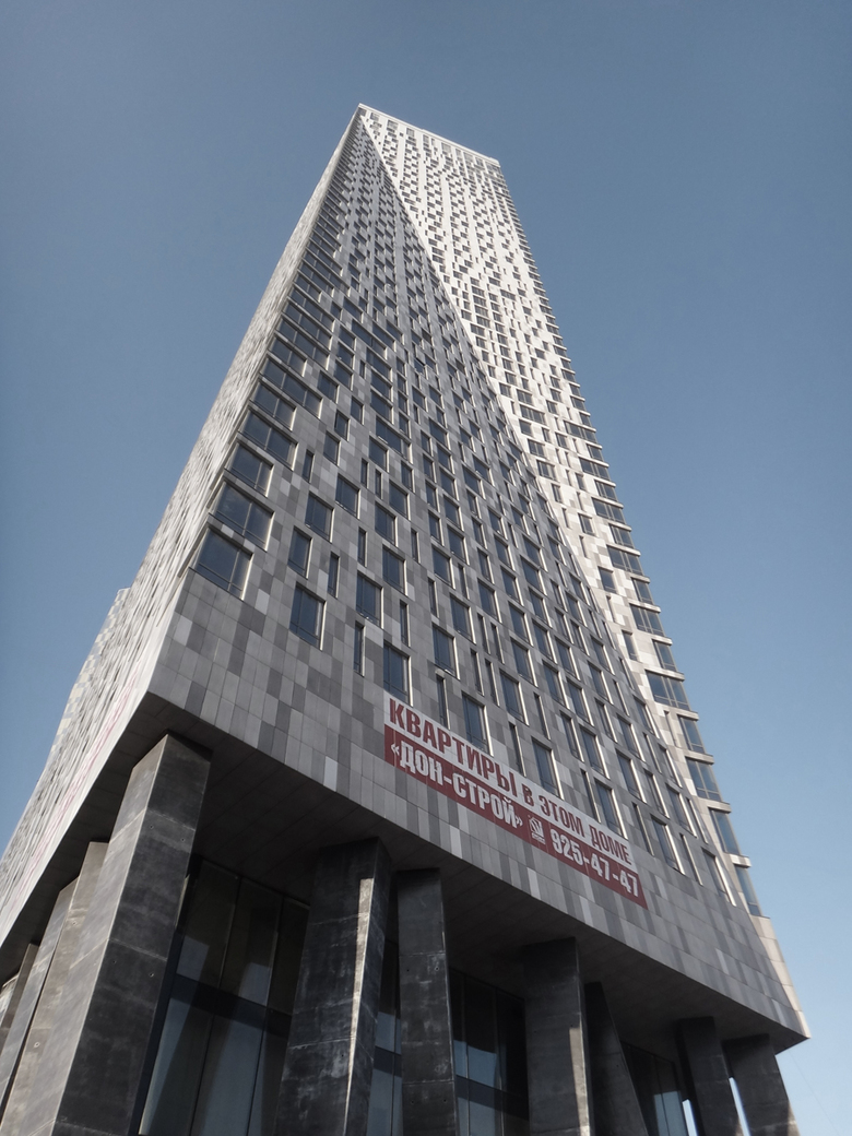Multifunctional complex representational features are the main tower 214-meters high and chip-like house 130-meters high. Both high-rise buildings are connected by third structure consisting of two parallel 8 storey units so that an atrium is formed in between them, with well lit inner space (in spite of giants standing nearby). The whole composition is positioned on three-level stylobate which contains underground parking lots, trade and sports rooms, well accomplished roof with dwelling and offices entrance groups, sport grounds and R&R areas, separate units for trade center and offices. The connecting low storey houses and the main tower are lifted up for 17-meters supported by almost chaotically tilted columns high made of coal black cast-in-situ concrete.