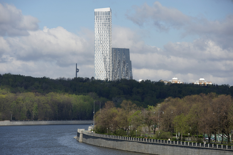 The Dwelling complex is located very closely to the wide open spaces of Poklonnaya Gora and the valley of the Setun River. Its composition was dictated by existing urban situation and originally consisted of two symmetrical pairs slightly differing from each other. The first part of this pair is nearing its completion now. It was conceived and constructed as general urban accent just for the purpose of versatile apprehension from well known observation points in Moscow. The place for construction site was chosen on the top break point of the longitudinal profile of the famous street in the city. The spot of the complex itself managed to occupy only vacant spaces within city blocks and not a single existing house in the area had been touched. The skyscraper`s architecture responds to the scarceness of buildings in the district, famous for the rich greenery of Moscow State University campus and vast territories of well-known "Mosfilm" factory of movies. The main tower serves as a landmark of the main entrance to it.
