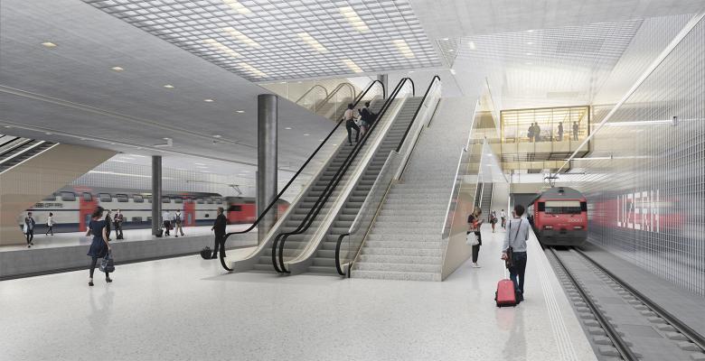 In enger interdisziplinärerer und fachübergreifender Zusammenarbeit zwischen Architekten, Ingenieuren und weiteren Fachspezialisten wurden massgebende technische Konzepte intensiv diskutiert und auf ihre Machbarkeit hin überprüft. Mit dem vorgeschlagenen Entrauchungskonzept beispielsweise kann auf abgehängte, die Raumqualität störende, Elemente verzichtet werden. Stattdessen werden begehbare, im Unterhalt günstige Kanäle im Rohbau von Boden und Decke integriert. Die identitätsstiftenden Oberflächenmaterialien wie Gussglas und Terrazzo sind langlebige und pflegeleichte Materialien, sie prägen den Durchgangsbahnhof und geben Charakter. Auf technische Installationen im Gleisbereich wie Beleuchtungskörper kann dadurch generell verzichtet werden.