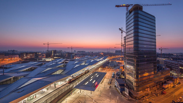 Als Knotenpunkt des öffentlichen Verkehrs mit einer skulpturalen Dachstruktur als städtebauliches Leuchtturmprojekt und Landmarke eines sich transformierenden Stadtviertels projektiert, gilt der Hauptbahnhof als Initialzündung für die Bebauung mehrerer Baufelder und das Anlegen des neuen Stadtparks auf der Basis dieses Masterplanes. Federführend bei der Realisierung des neuen Hauptbahnhofs Wien ist die ARGE „Wiener Team“ mit dem Architektenteam Hotz/Hoffmann-Wimmer. Theo Hotz Partner sind dabei verantwortlich für die das skulpturale Bahnhofsdach.