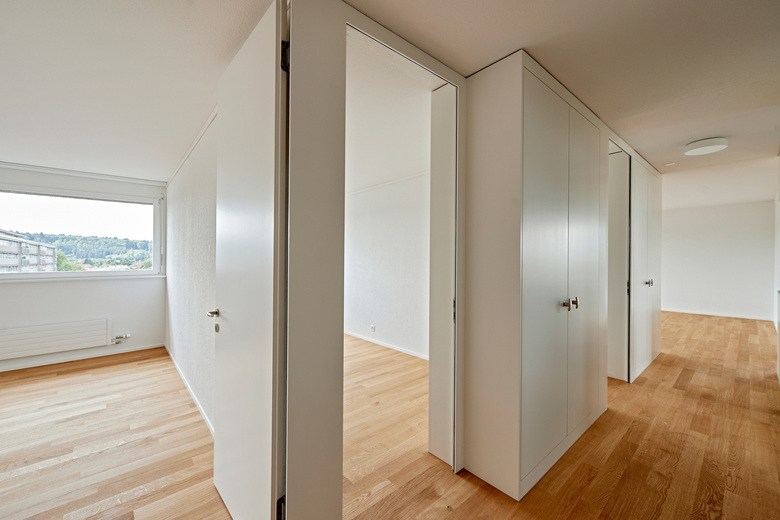 Die Wohnungen sind komplett saniert, ohne jedoch am Wohnungsspiegel Veränderungen vorzunehmen. Die kleinen, aber qualitätsvollen Drei- und Vierzimmerwohnungen sind strukturell nur im Bereich der Küchen und des Bads verändert. Zudem ist das Hochhaus den anspruchsvollen Vorschriften im Bereich Brandschutz und Erdbebensicherheit angepasst.