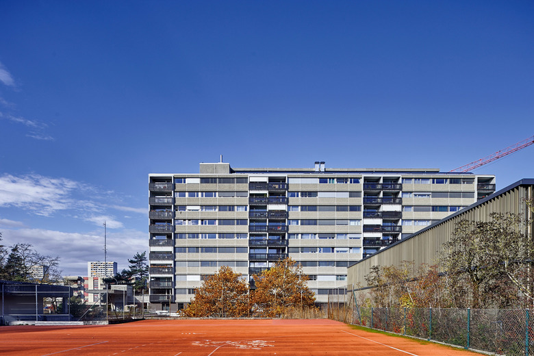 Das Scheibenhochhaus mit 54 Wohnungen an der Mühledorfstrasse bildet den nördlichen Abschluss des Fellerguts, einer Grossüberbauung aus den 1970er-Jahren. Gezielte Eingriffe in den Sockelgeschossen verändern die Orientierung des ganzen Gebäudes: aus der vernachlässigten Rückfassade wird neu eine attraktive und lebendige Zugangsfassade.