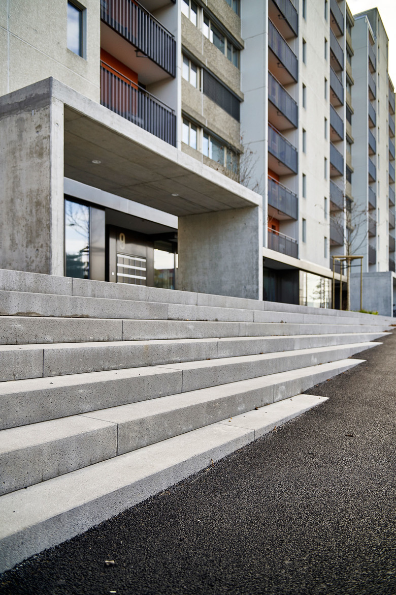 Die neugestalteten Hof- und Erdgeschossfassaden bilden für das Scheibenhochhaus einen Sockel und ermöglichen eine erhebliche energetische Verbesserung. Die Betonelementfassade wurde von Aussen bewusst nicht verändert, um die Zugehörigkeit zum einheitlich gestalteten Fellergut nicht zu schwächen. Stattdessen wurden die Aussenwände mit einer Innendämmung und neuen Fenstern energetisch verbessert. Die Glasbrüstungen der Balkone, welche das Erscheinungsbild des Fellerguts prägen, mussten aus Sicherheitsgründen ersetzt werden. Dunkel gehaltene und gelochte Trapezbleche bilden neu einen adäquaten Ersatz.