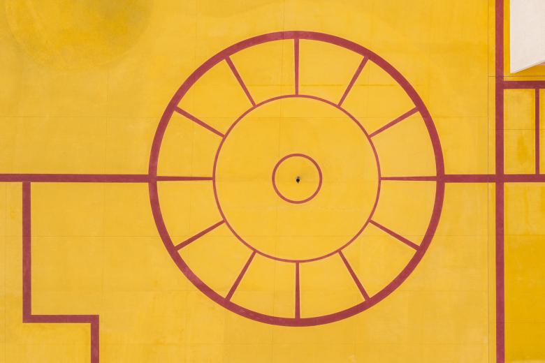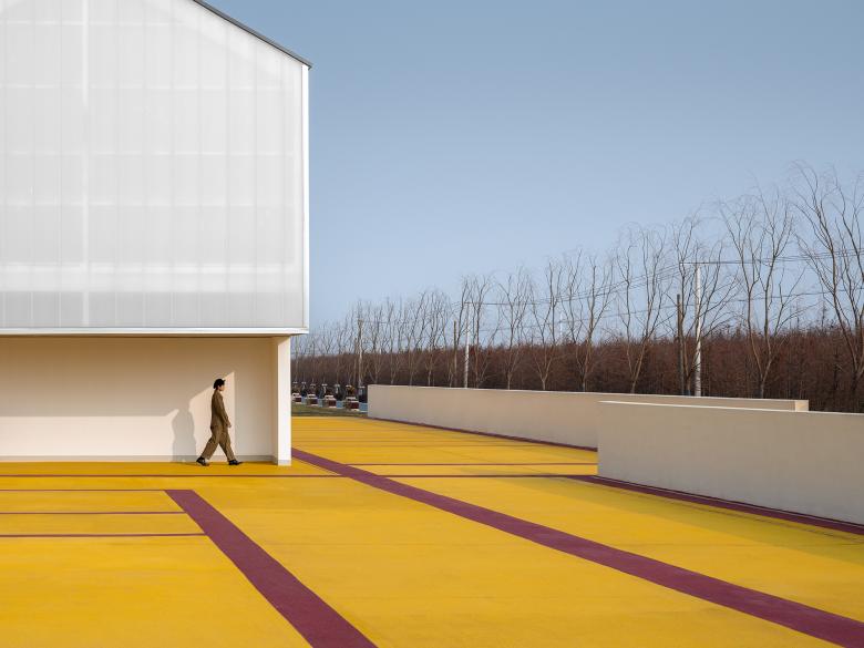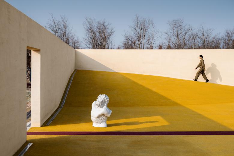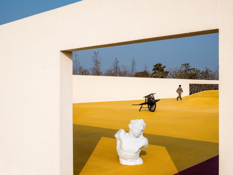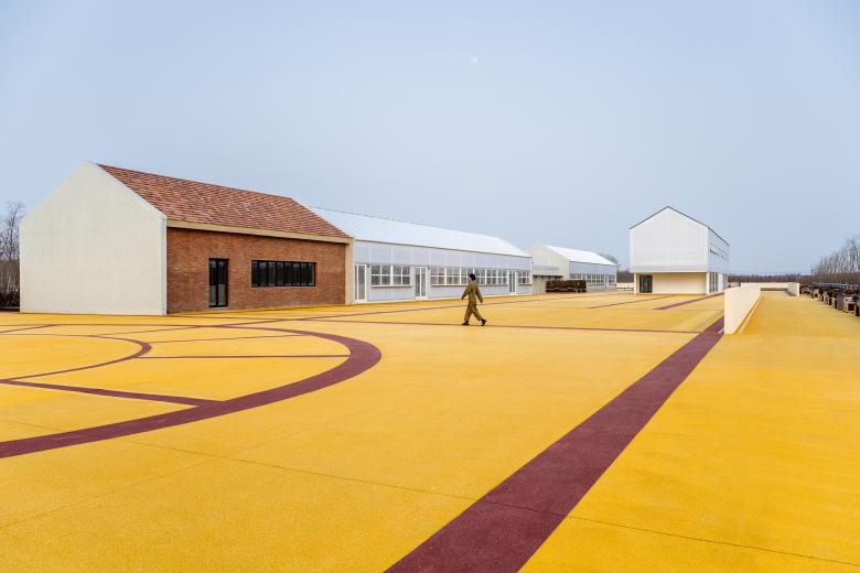 So I decided to use the golden color to symbolize the harvest field, the harvest that never ends. I simply wanted the Cockaigne to be a place of "eternal leisure, superb food, and edible buildings". It was paradise. At that time, we had no desire to stay in the countryside, but now we envy it a little. After all the surprises of life, I think the simplest pleasures are precious. Wutopia Lab uses golden yellow permeable concrete, resembling paddy, with dark red lines to form an everlasting barnyard scene: some are divided into blocks, some are scalloped, and in the open areas the terrain rises slightly, forming a "grain pile" with undulating heights on which to stand. Looking at the whole field, it seems to be a frozen harvest time.