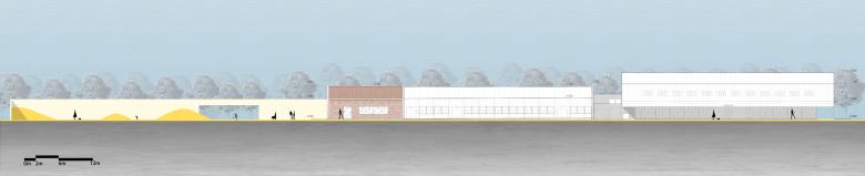 At the end of the site, the original toilets are designed as another future capsule (movable installations), and the dark red ground line is transformed into a four-pronged cone made of weather-resistant steel plates that can be opened and closed, inside which a large number of memory store, the contents of which are a message or a piece of data for future relatives, friends, or even oneself. Different materials of the building, like different memories, are scattered in this yellow cereal field, and every time you enter one, it seems to trigger a story of different times waiting for you to explore.