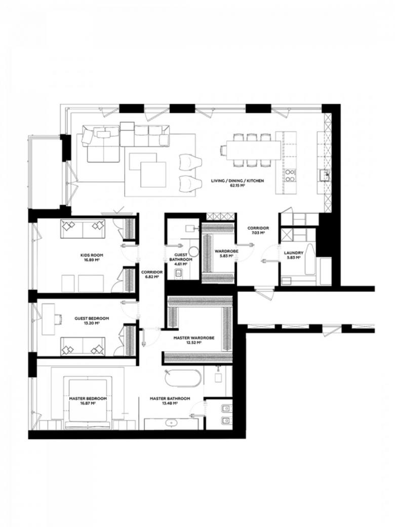 When you enter the apartment, a feeling of warmth and comfort is floating in the air due to the color palette, the abundance of natural light from the spacious windows, and the harmonious arrangement of furniture. Our team has executed this project in a warm nude palette without overloading the overall concept with bright accents.