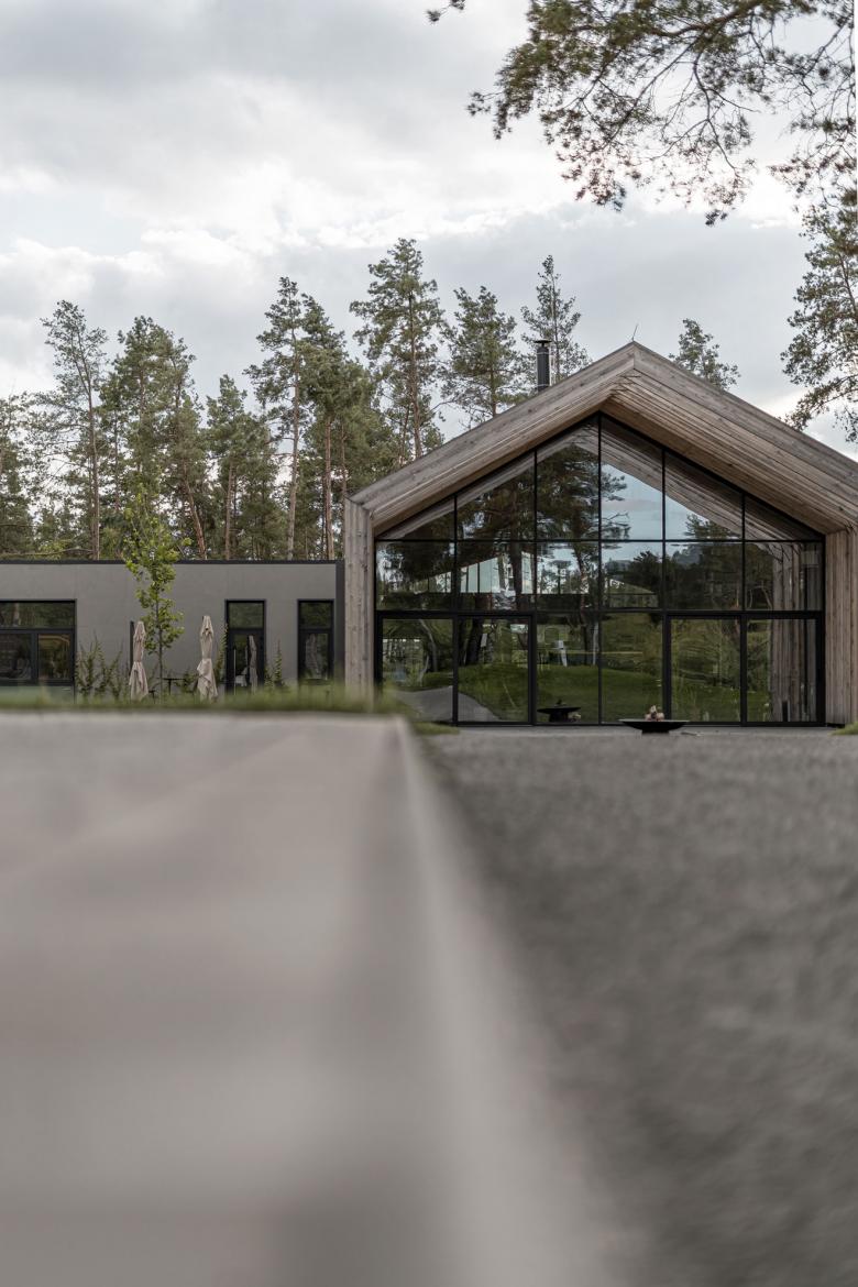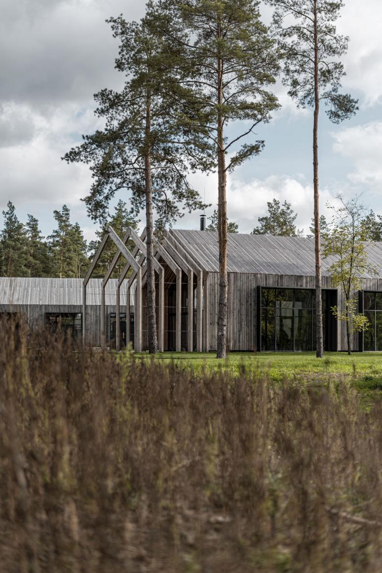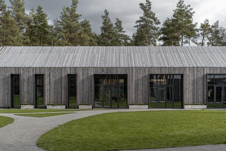 Both buildings are 1200 sq m in size and consist of pine beams, which are arranged with a certain rhythm, somewhat reminiscent of huge open birdhouses. The main emphasis is on the environmental friendliness not only of the atmosphere but also of the materials used. Thus, pine of the same species that grows in the forest that surrounds the recreational complex was chosen as the main construction material. The architects lined the outer cladding of the facades with wooden battens and made the interior spaces as open as possible with visible structural trusses so that the buildings look free.