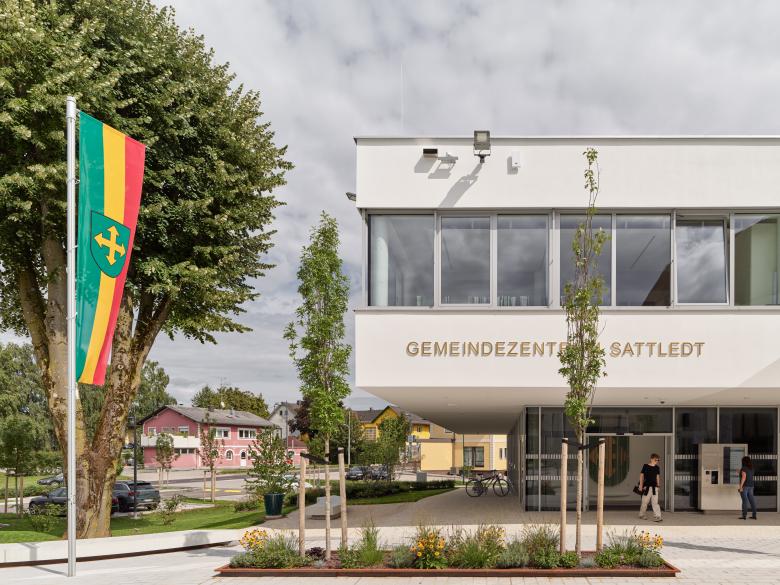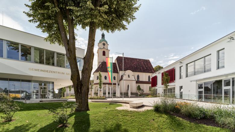 Ortsplatz mit Gemeindezentrum und Kommunalbau