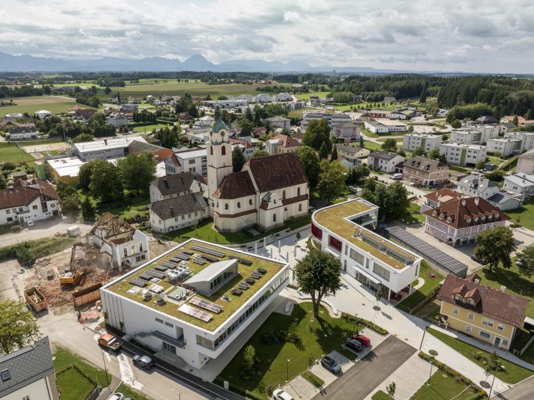Vogelperspektive neues Ortszentrum mit Gemeindezentrum, Kommunalgebäude