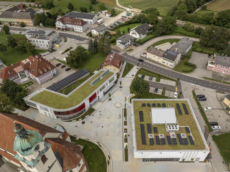 Vogelperspektive neues Ortszentrum mit Amtsgebäude und Kommunalbau