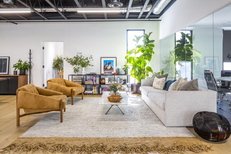 The landscaped courtyard, a former driveway to access the ground floor garage, is used as an outdoor work area, open- air lounge and lunch room, and presentation space. Courtyard adjacent exterior walls serve as a canvas for local artists, while the amphitheater is a venue for hosting community events.
